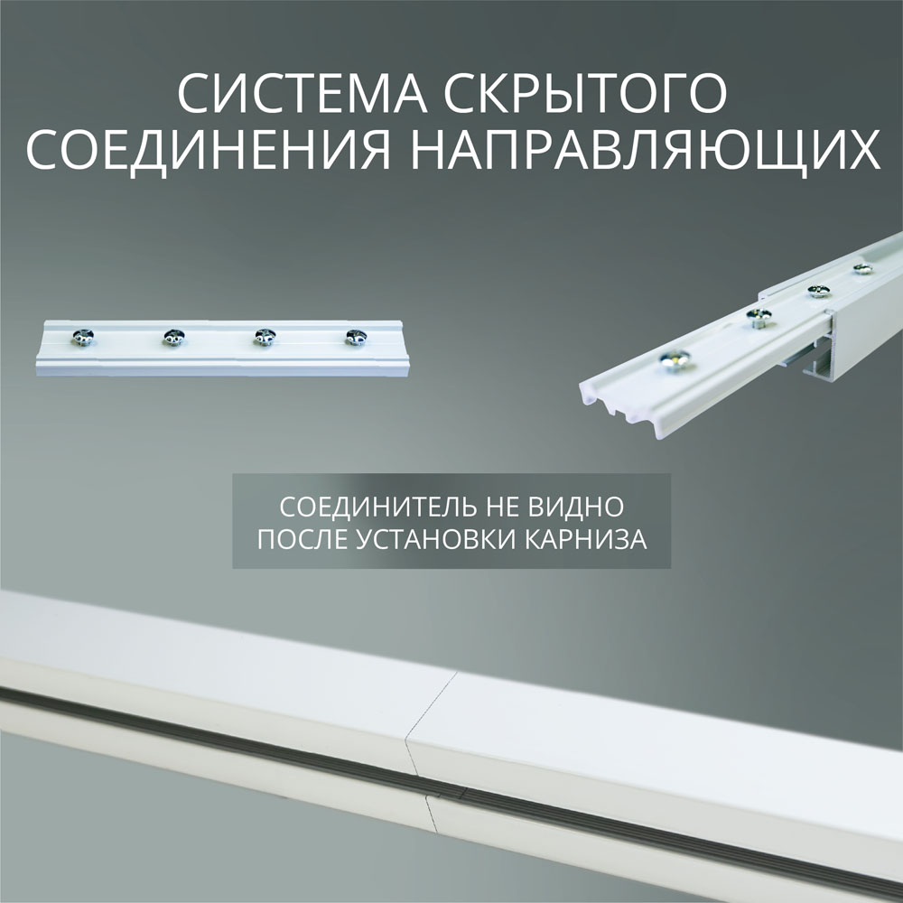 Алюминиевые детали произведены в России, профиль имеет толщину стенок не менее 1,5мм и способен выдержать нагрузку штор до 50кг с общей длиной конструкции до 12 метров. Соединитель частей профиля вставляется во внутреннюю полость профиля и скрыт от глаз после установки карниза.