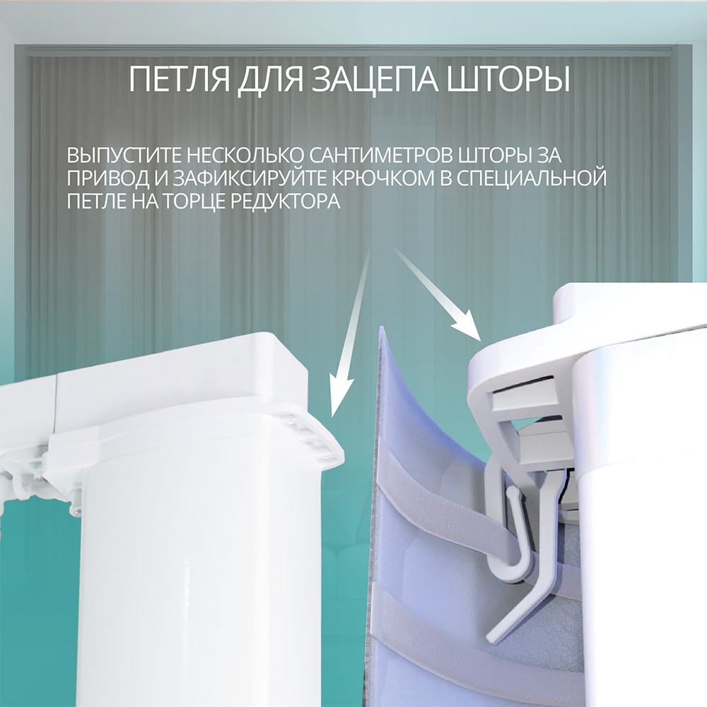 Выпустите несколько сантиметров шторы за привод и зафиксируйте крючком в специальной петле на торце редуктора.