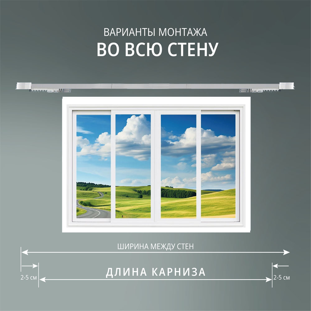 В комплекте поставляется закладной профиль для электрокарниза, он монтируется вместе с натяжным потолком, имеет с обоих сторон пазы для гарпунного крепления потолочного полотна. Вместе с ним поставляются 2 торцевых заглушки. В зависимости от выбранной длины карниза - в комплекте будет необходимое кол-во закладного профиля хлыстами длиной 1,8 метра.