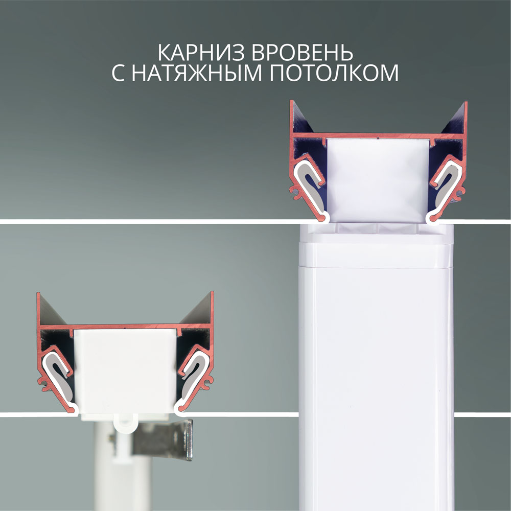 Комплект включает в себя специальные детали, такие как: закладной потолочный профиль и заглушки для него, специальные редукторы для электрокарниза узкого формата, соединители профилей и крепежные элементы. В результате электрокарниз вставляется в закладной профиль и составляет одну плоскость с натяжным потолком.