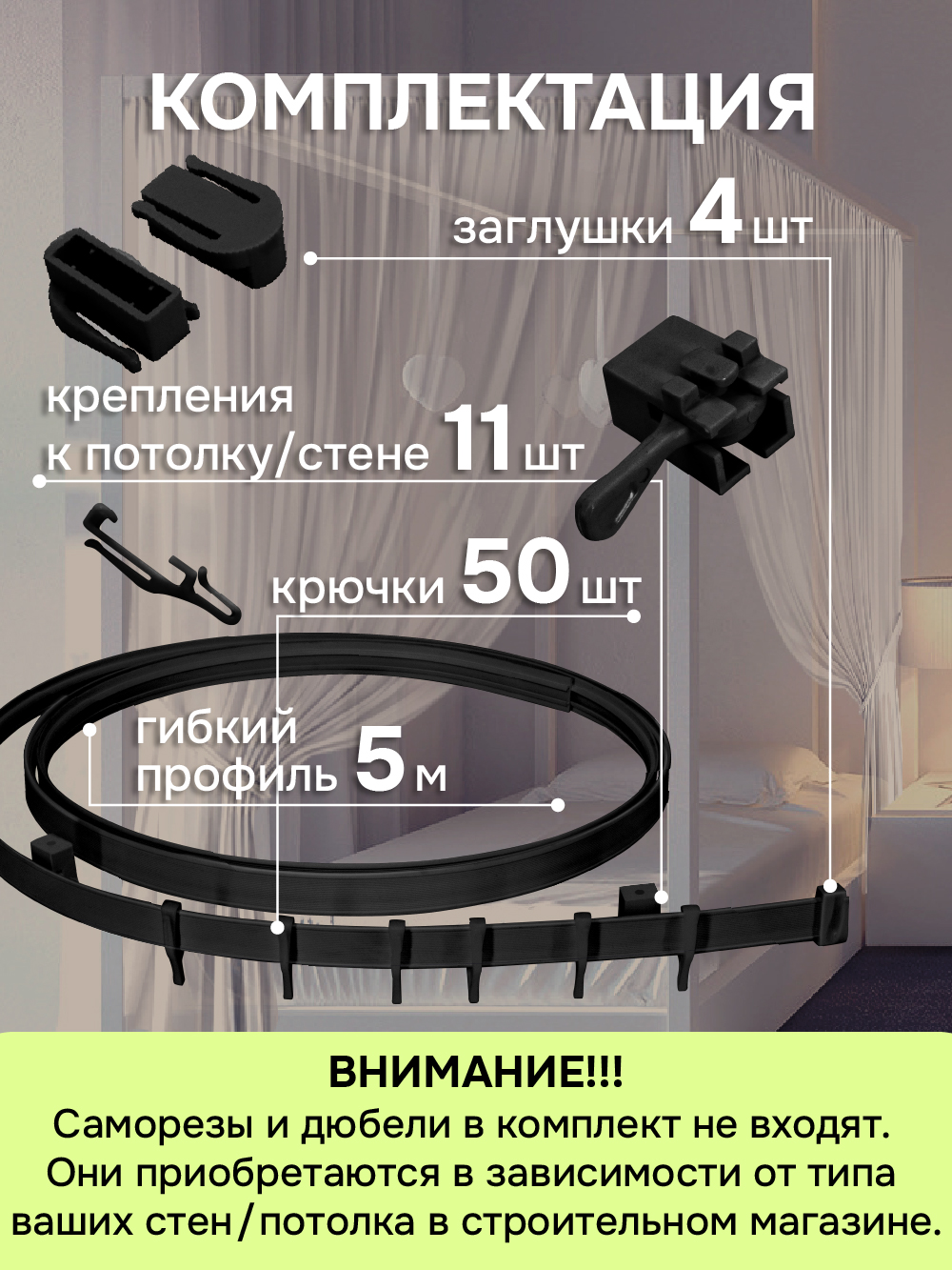 Гибкий карниз, крючки, крепежи, заглушки