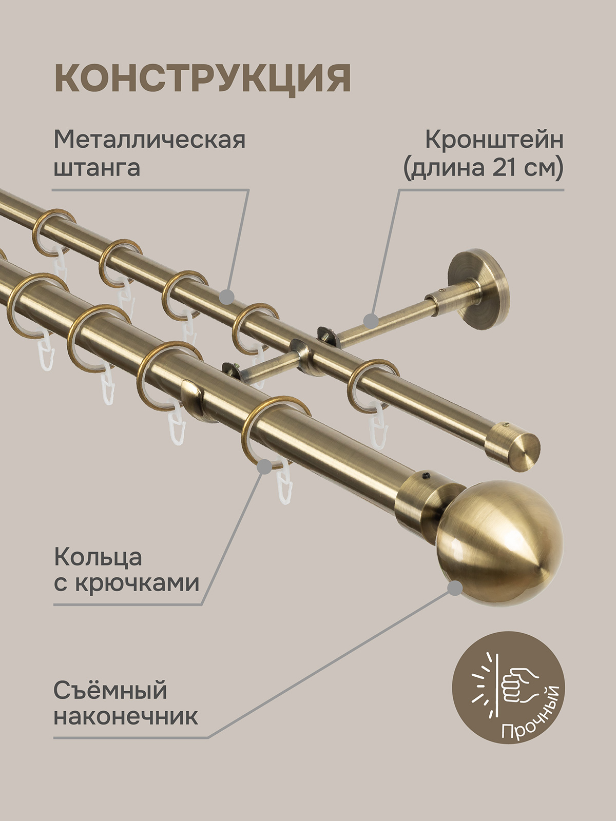 штанга 175 см - 4 шт, кронштейн - 3 шт, наконечник - 2 шт, наконечник-заглушка - 2 шт, соединитель - 2 шт, кольца - 70 шт, крючки - 70 шт