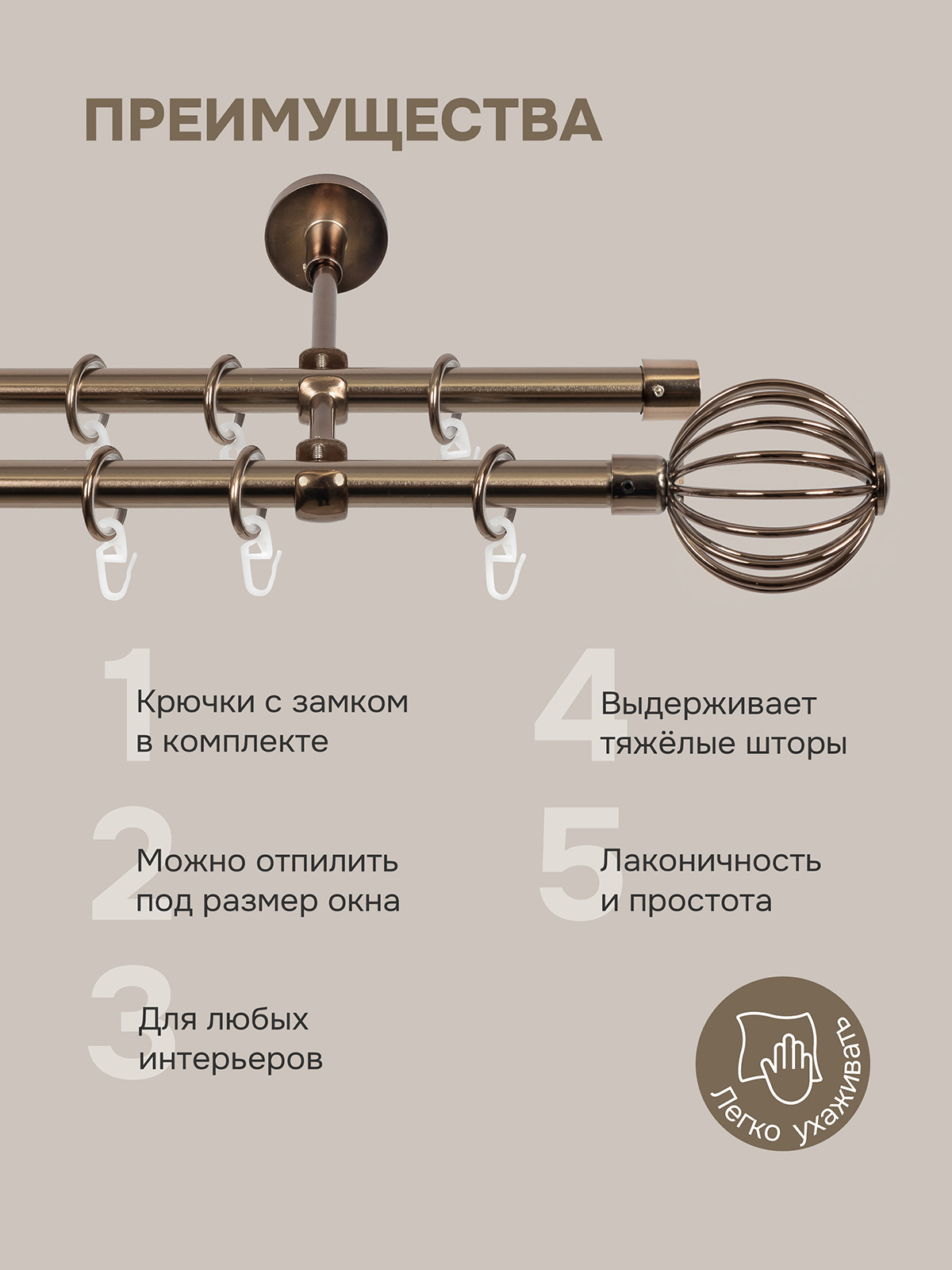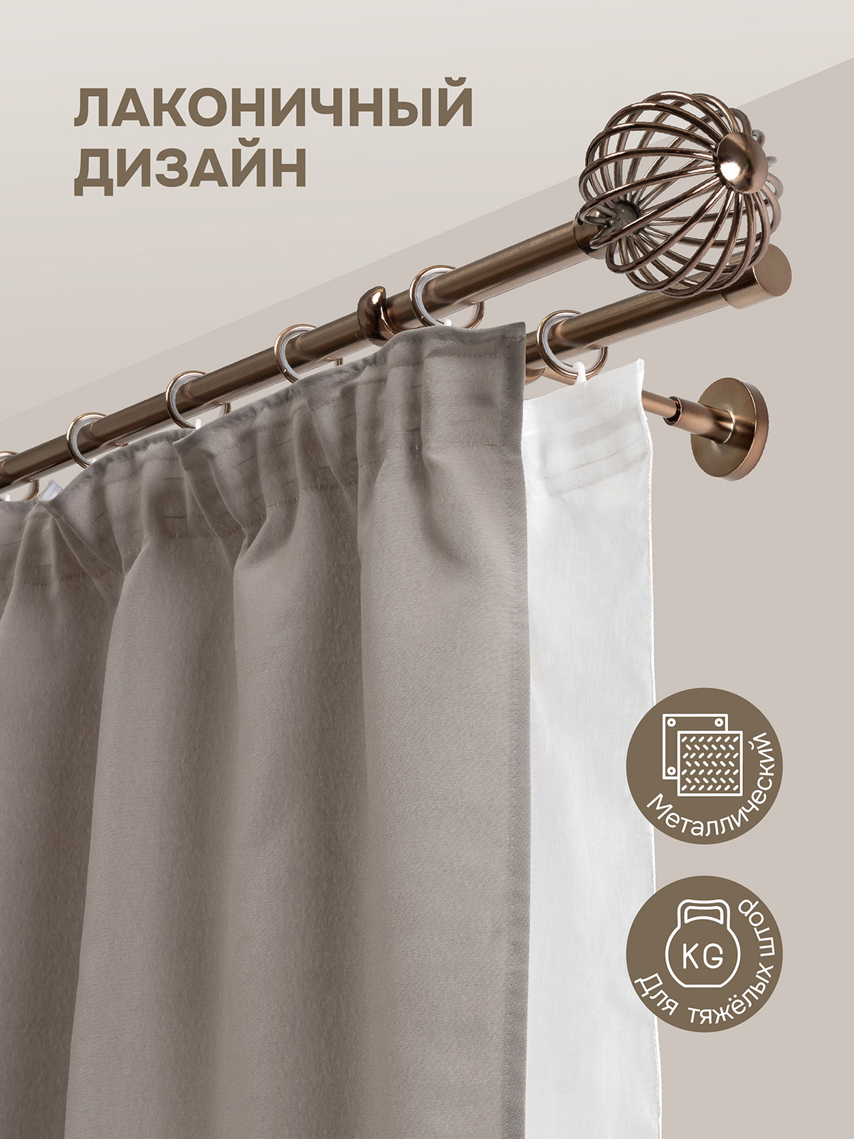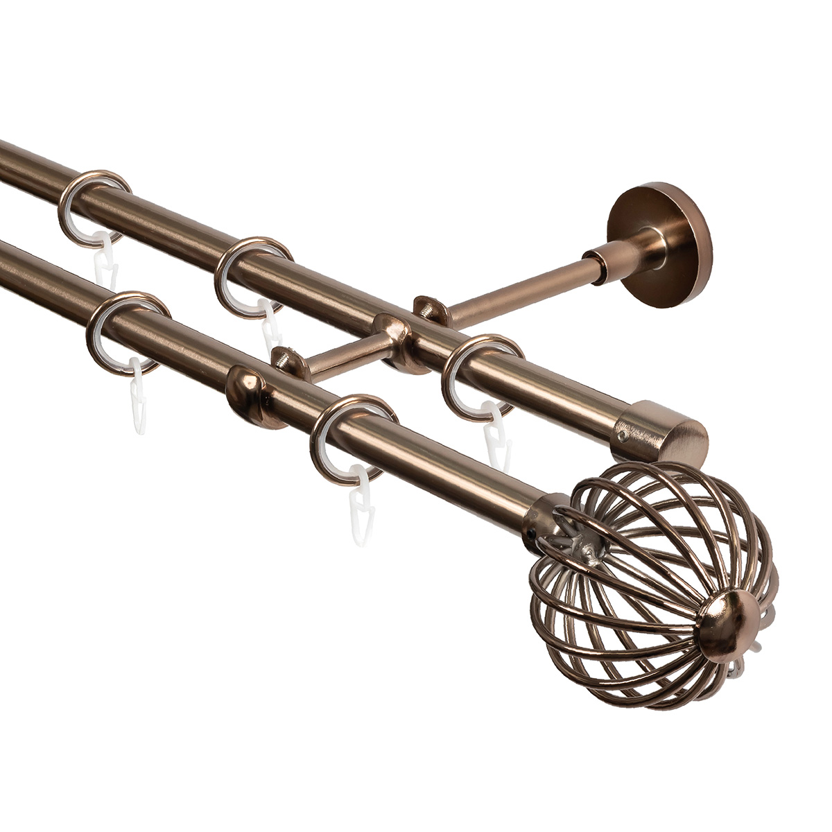 Карниз для штор двухрядный, настенный, штанги 16 мм, Шар кованый, коньяк