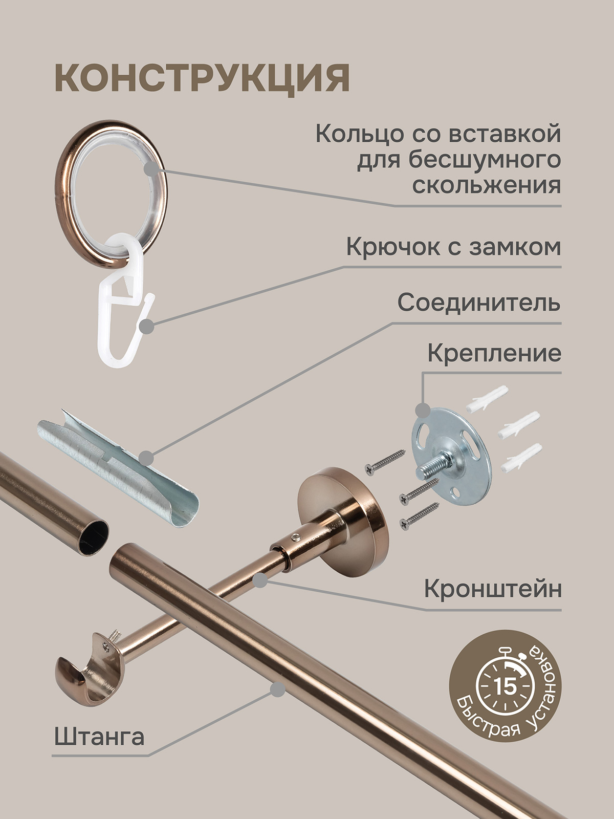 штанга 175 см - 2 шт, кронштейн - 3 шт, наконечник - 2 шт, соединитель - 1 шт, кольца - 35 шт, крючки - 35 шт
