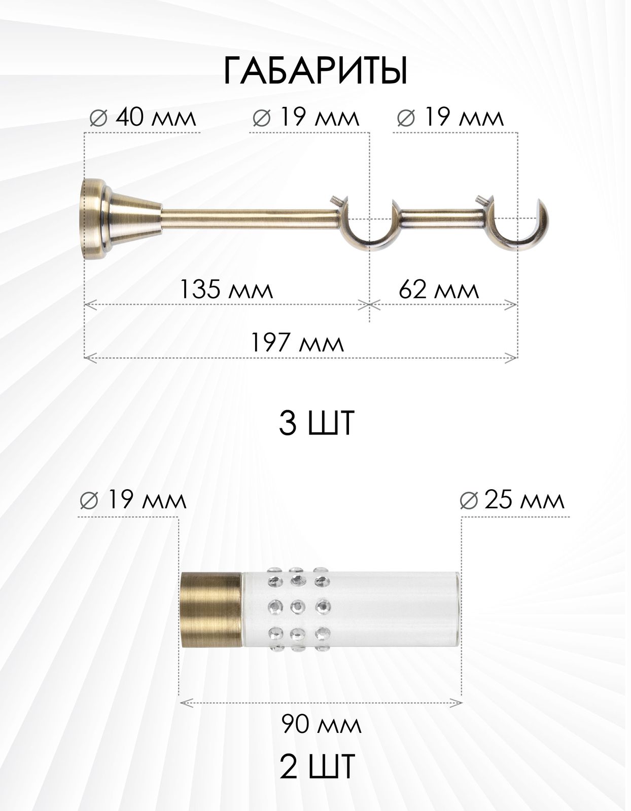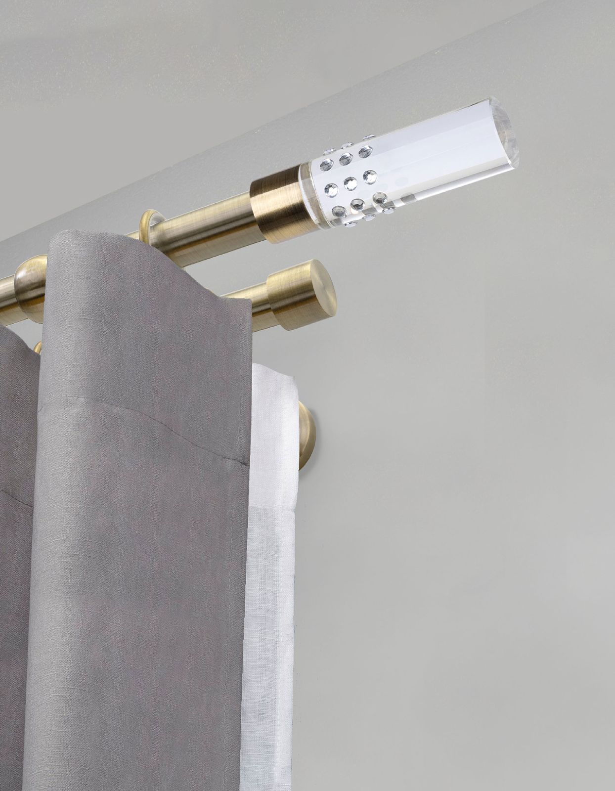 Карниз комплектный 2-рядный, металл, 19/19мм, латунь, Цилиндр "Стеклянный", 200см