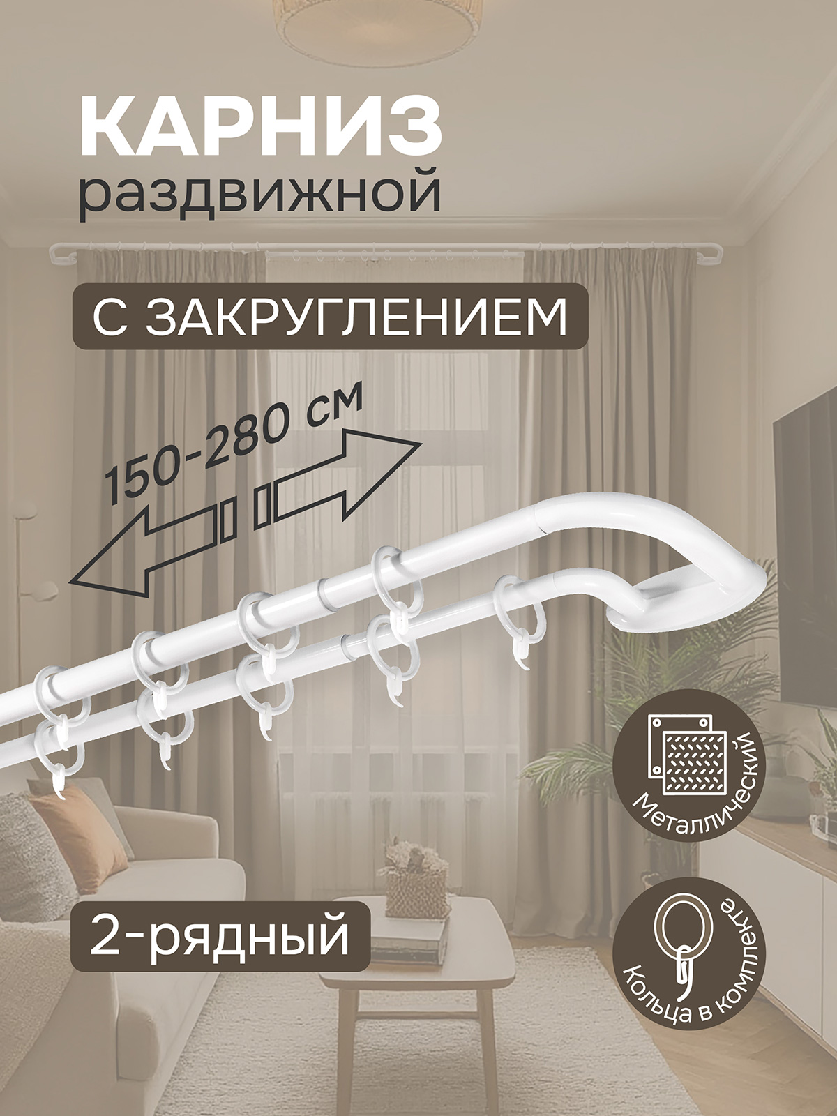 Карниз раздвижной двухрядный с закруглением 150-280см, белый