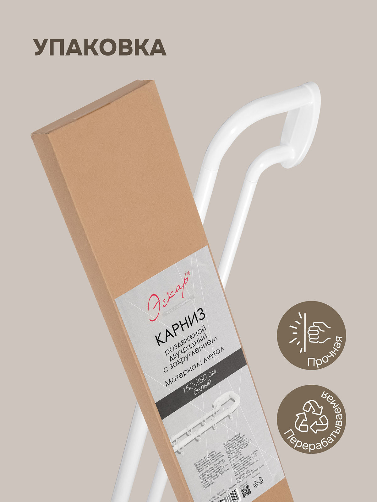 Карниз для штор двухрядный (2 ряда) металлический 280 см. Диаметр внутренней трубы 13/16мм, внешней - 16/19 мм. Минимальная длина 150 см, максимальная - 280 см. Металлические кольца в комплекте. Раздвижной карниз - универсальное типовое решение, не требующее точных замеров длины изделия. Необходимая длина выставляется непосредственно при креплении карниза. Широкий размерный диапазон от 150 до 280 см позволяет использовать данную модель в большинстве прямых оконных проемов. Выбор карниза в данном случае сводится к выбору декоративных составляющих - цветовой гамме, наконечнику и необходимому функционалу - рядности, исключая предварительные замеры и подбор комплектующих.Данный вид карнизов открывает большие возможности при подборе функционального решения в оформлении окна. Комплектация: карниз раздвижной 4 штанги; держатель для штанг 1 шт; кольца с крючками 30 шт; комплект крепежа; инструкция по сборке 1 шт. Упаковка - коробка.
