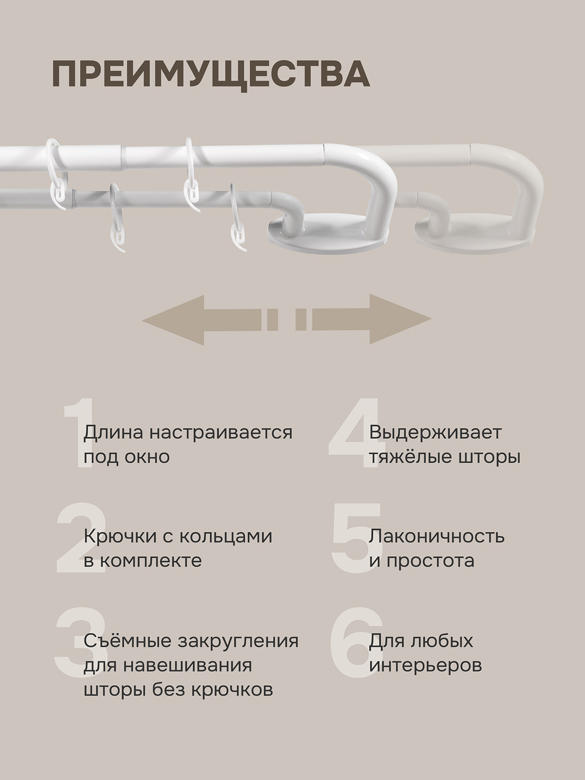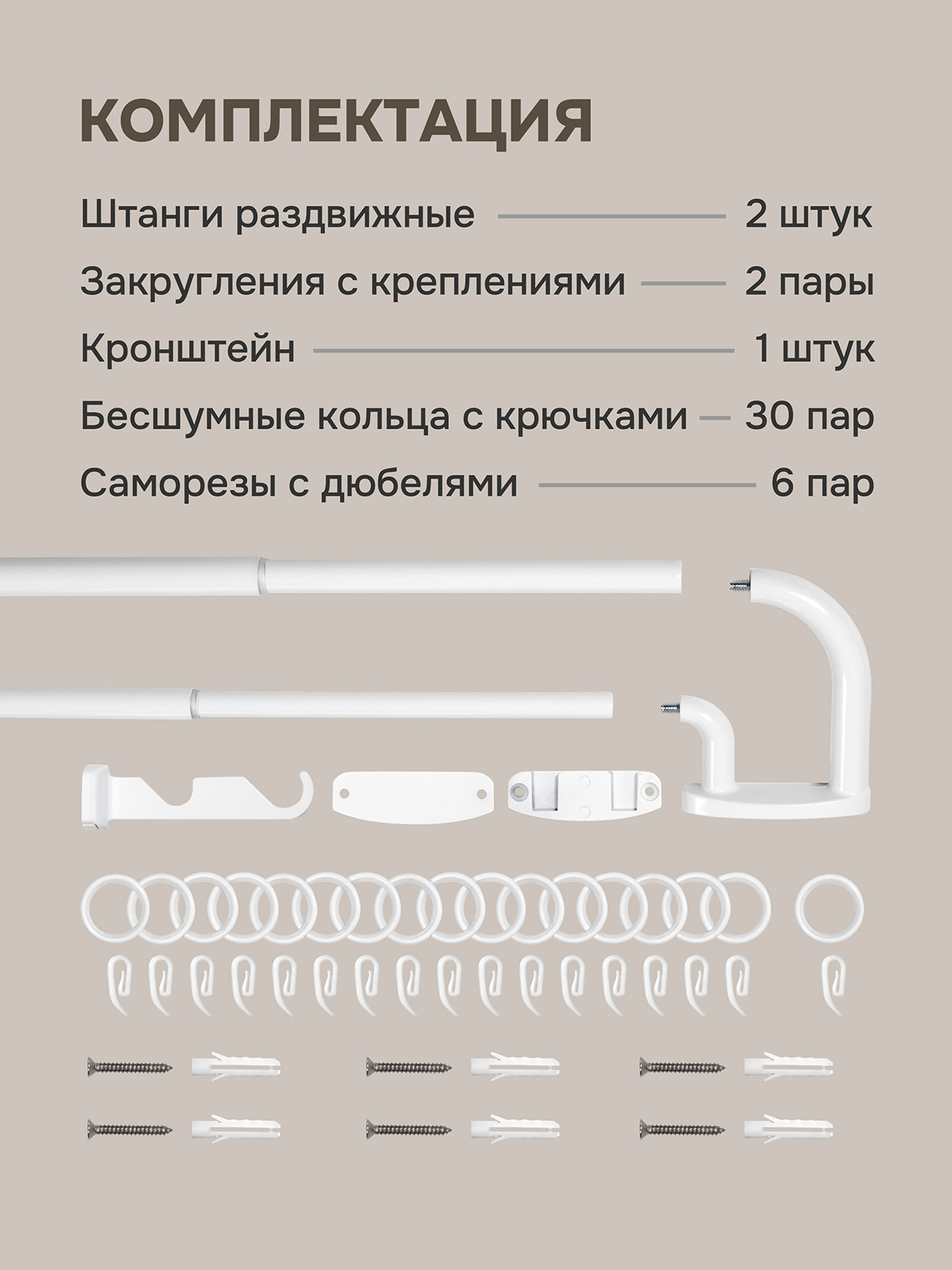 карниз раздвижной 4 штанги, держатель для штанг 1 шт, кольца с крючками 30 шт, комплект крепежа, инструкция по сборке 1 шт.