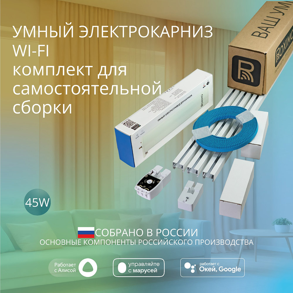 Это готовый предсобранный комплект, пользователю остается только соединить направляющие и закрепить карниз к потолку или настенным креплениям. Все необходимые элементы входят в комплект, в т.ч. умный электропривод с большим запасом мощности - 45 Ватт, что позволяет использовать шторы весом до 50кг и длиной до 12 метров.