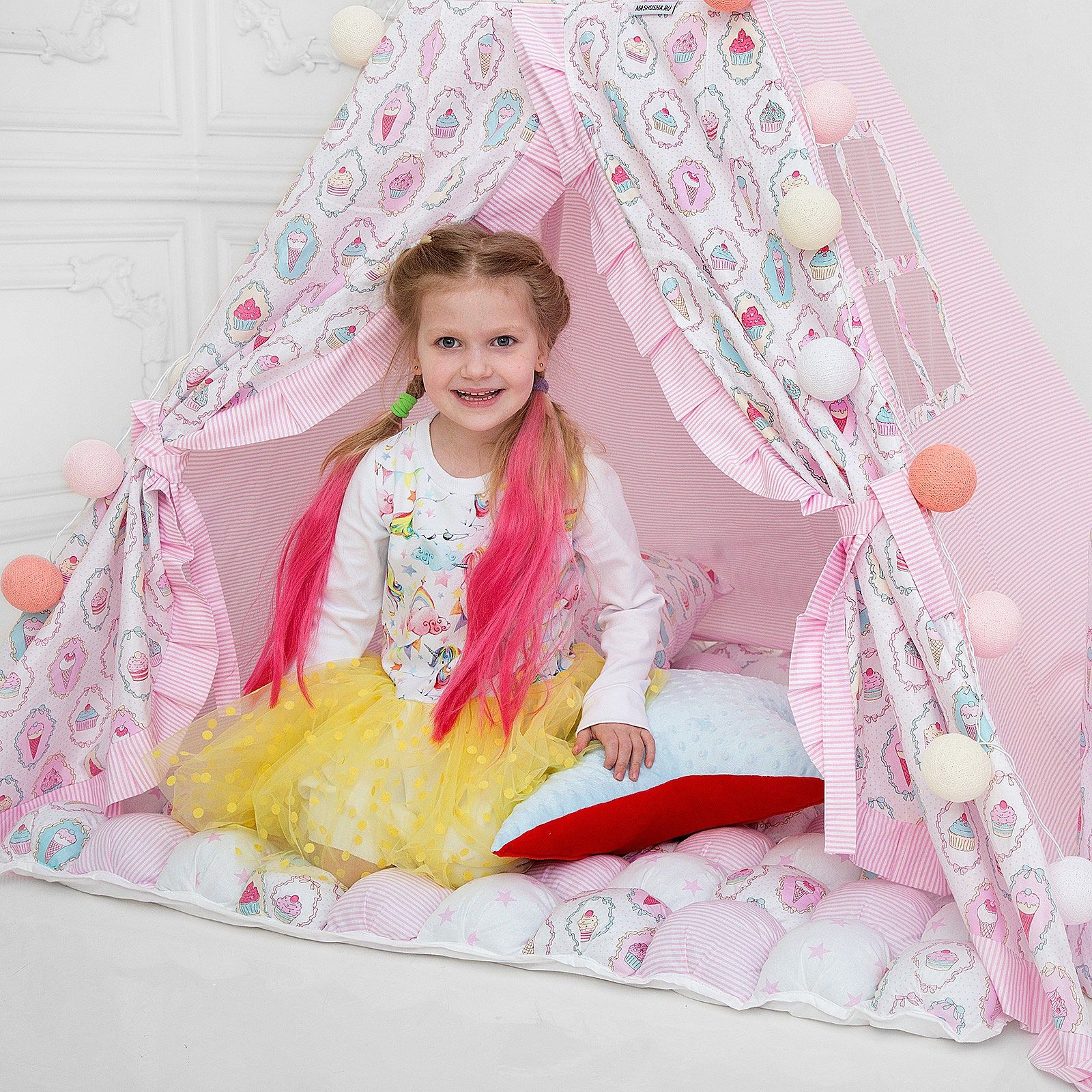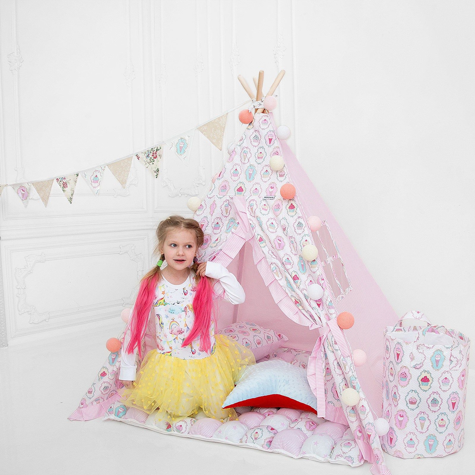 Детский вигвам из натуральной ткани на 4-х деревянных ножках в комплекте с ковриком БомБон, Флажками на палочках и Системой Антискладывания.