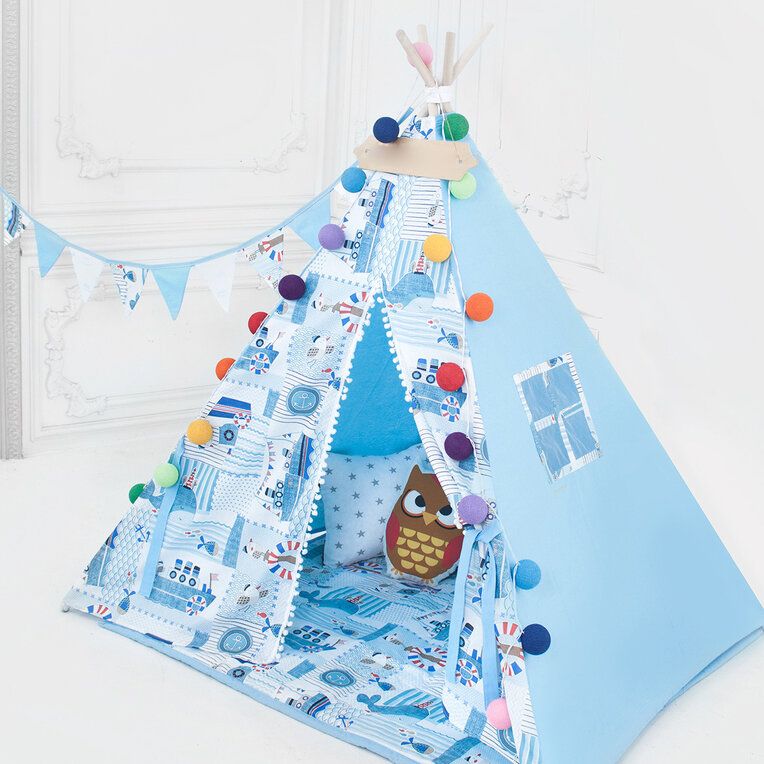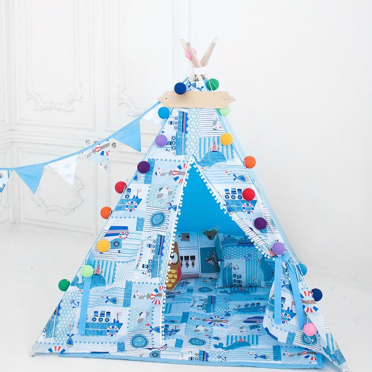 Детский ВигВам из натуральной хлопковой ткани на 4-х деревянных ножках в комплекте с окошком, ковриком, флажками и системой антискладывания.