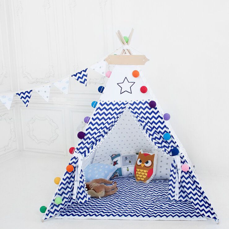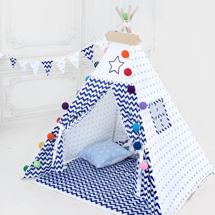 Детский ВигВам из натуральной хлопковой ткани на 4-х деревянных ножках в комплекте с окошком, ковриком, флажками и системой антискладывания.