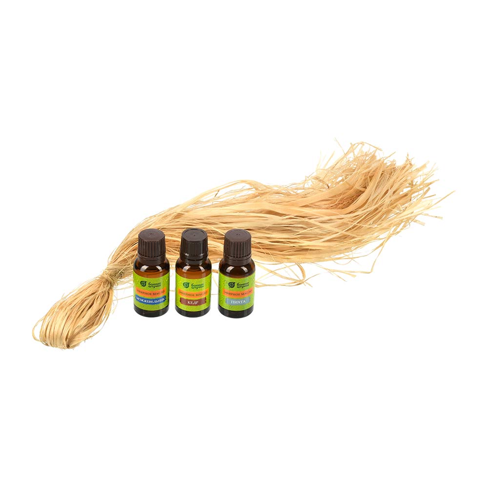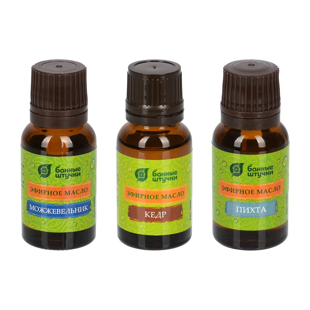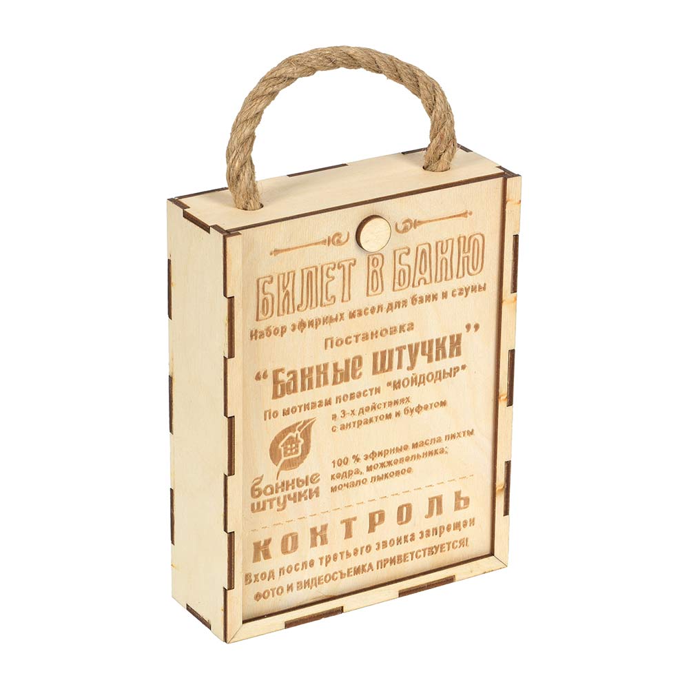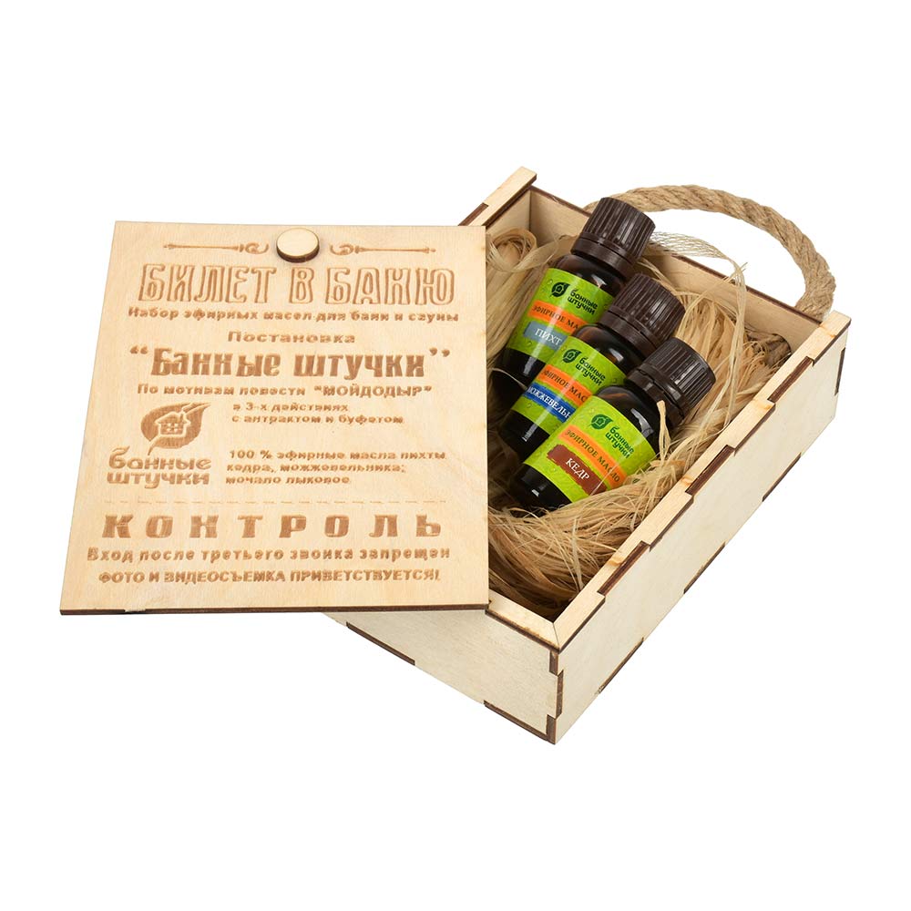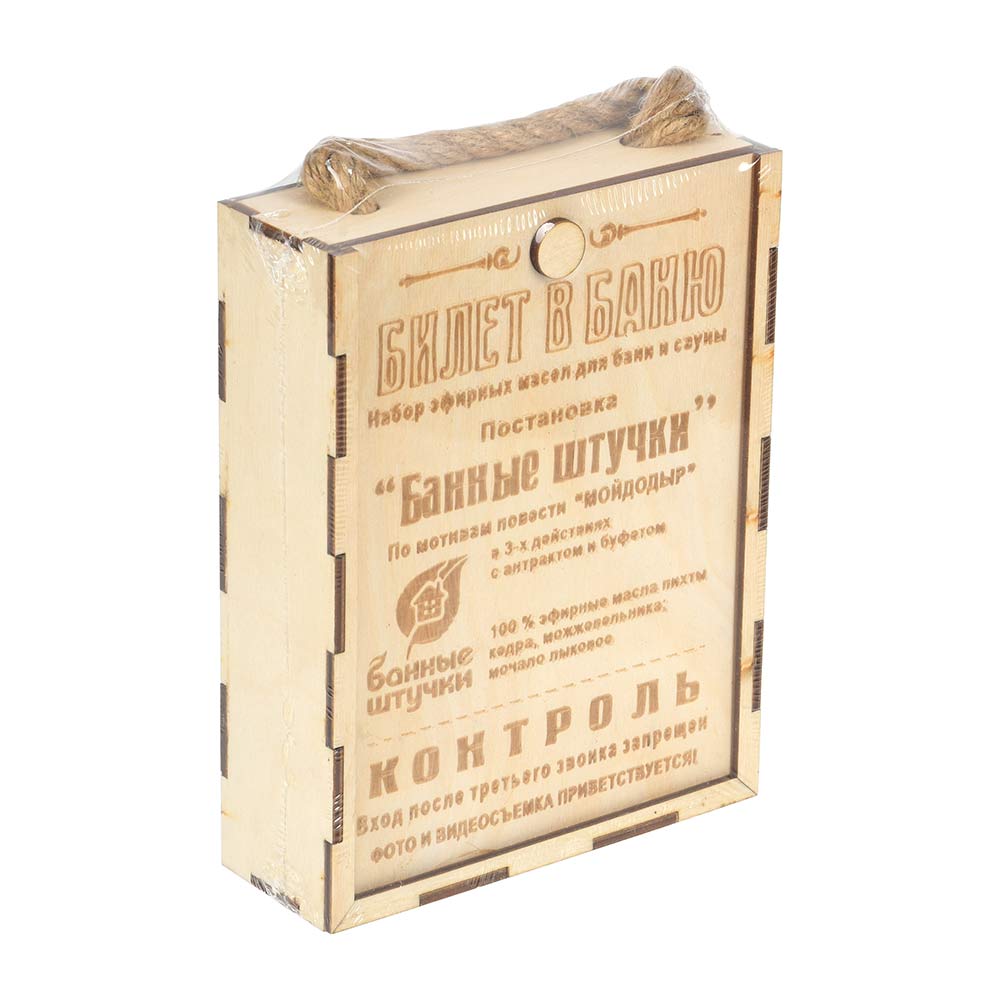 Набор эф.масел "Билет в баню" (пихта,кедр,можж,мочало лыко) 3 масла по 15 мл в дерев.коробочке "Банные штучки"