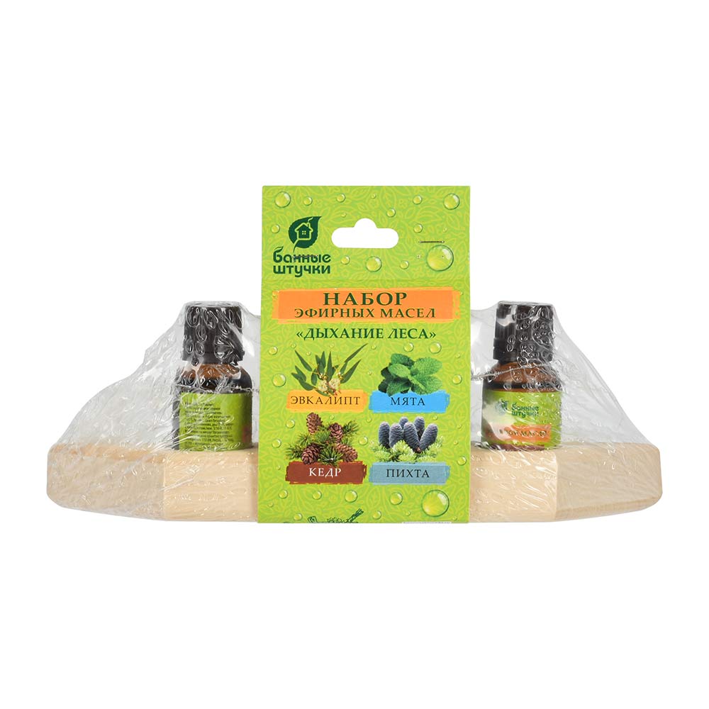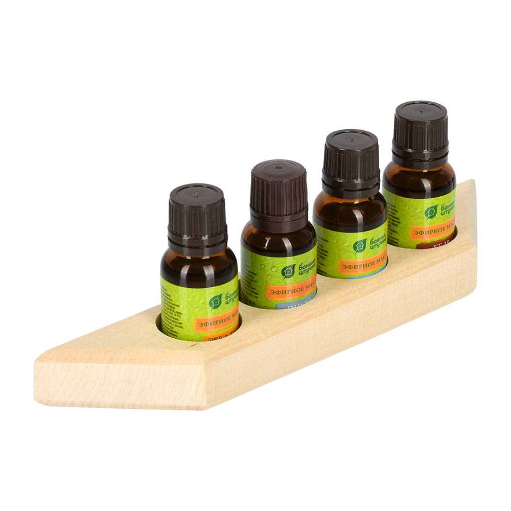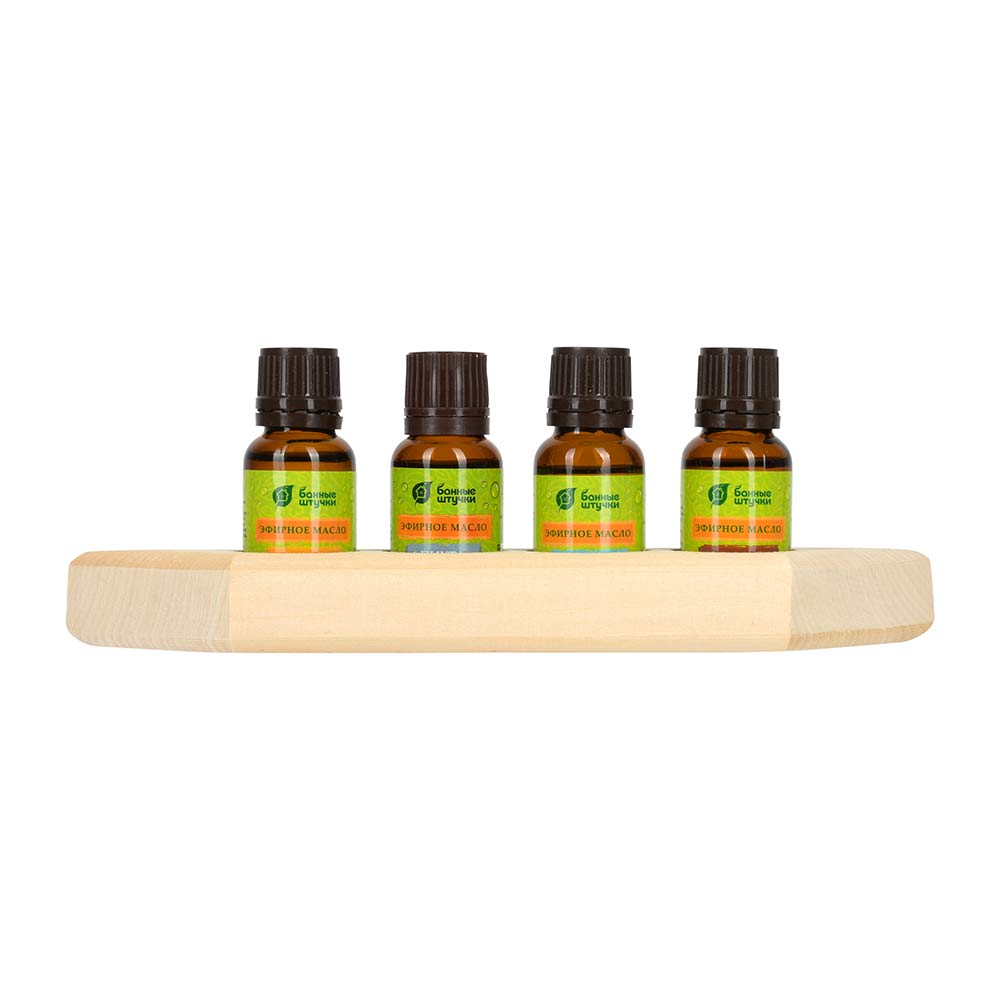 Набор эф.масел "Дыхание леса" (эвкалипт,пихта,кедр,мята) 4 масла по 15 мл на дерев.полочке "Банные штучки"