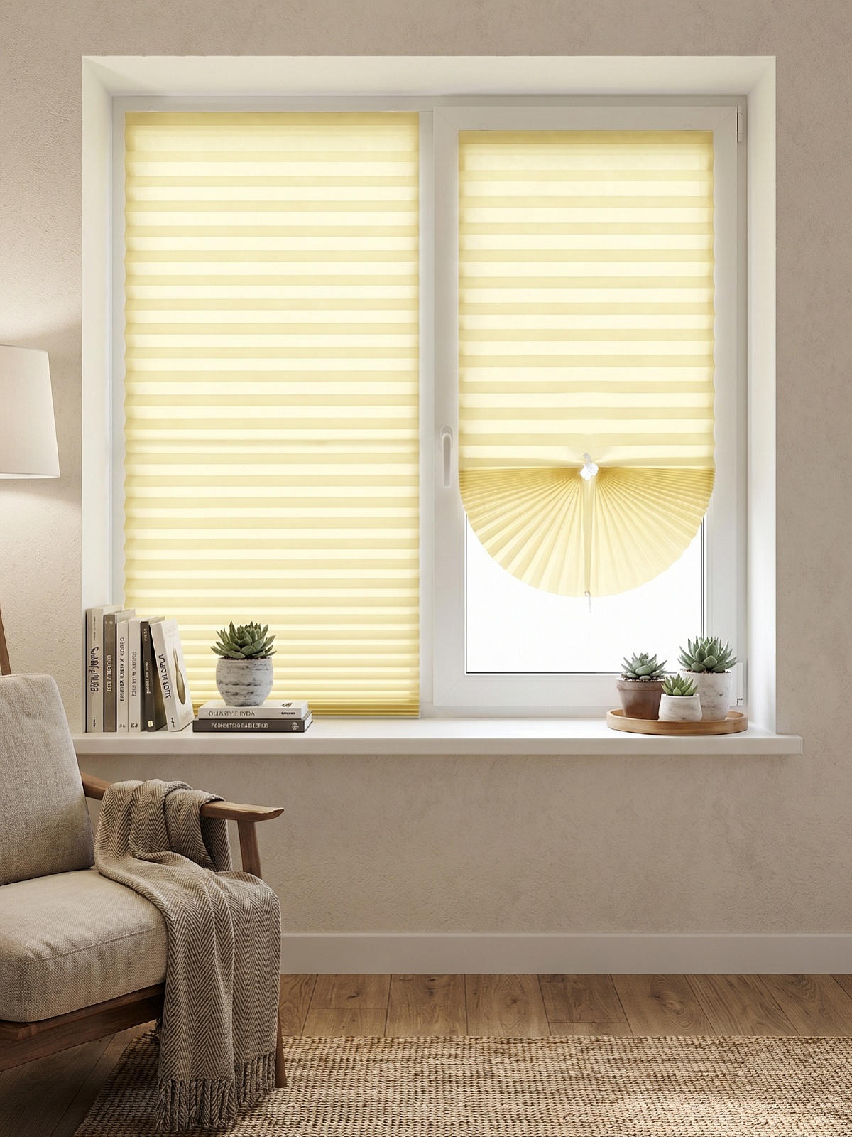 Плиссе - система солнцезащиты позволяющая регулировать проникновение света в комнату. Благодаря особенности конструкции плиссе собирается в сборку как с нижней части окна, так и с верхней, путем верхнего и нижнего натяжения. Это позволяет закрыть часть окна, либо полностью закрыть окно. В отличии от рулонных штор - вы можете оставить открытой верхнюю часть стекла.