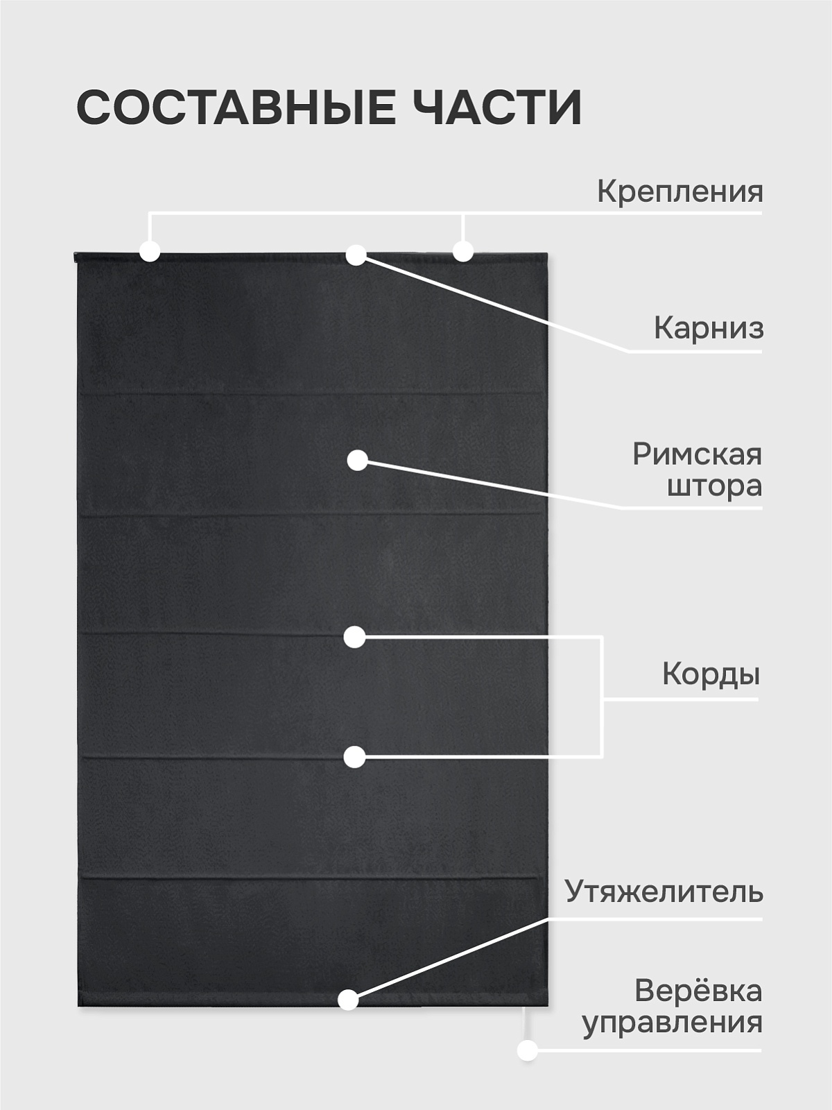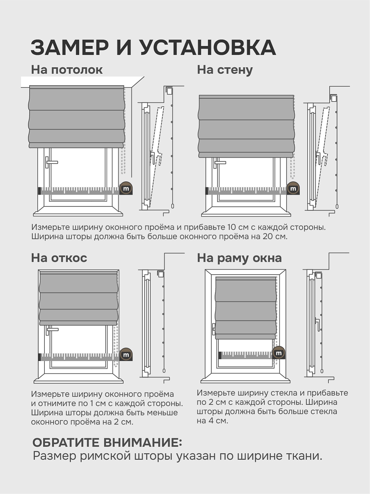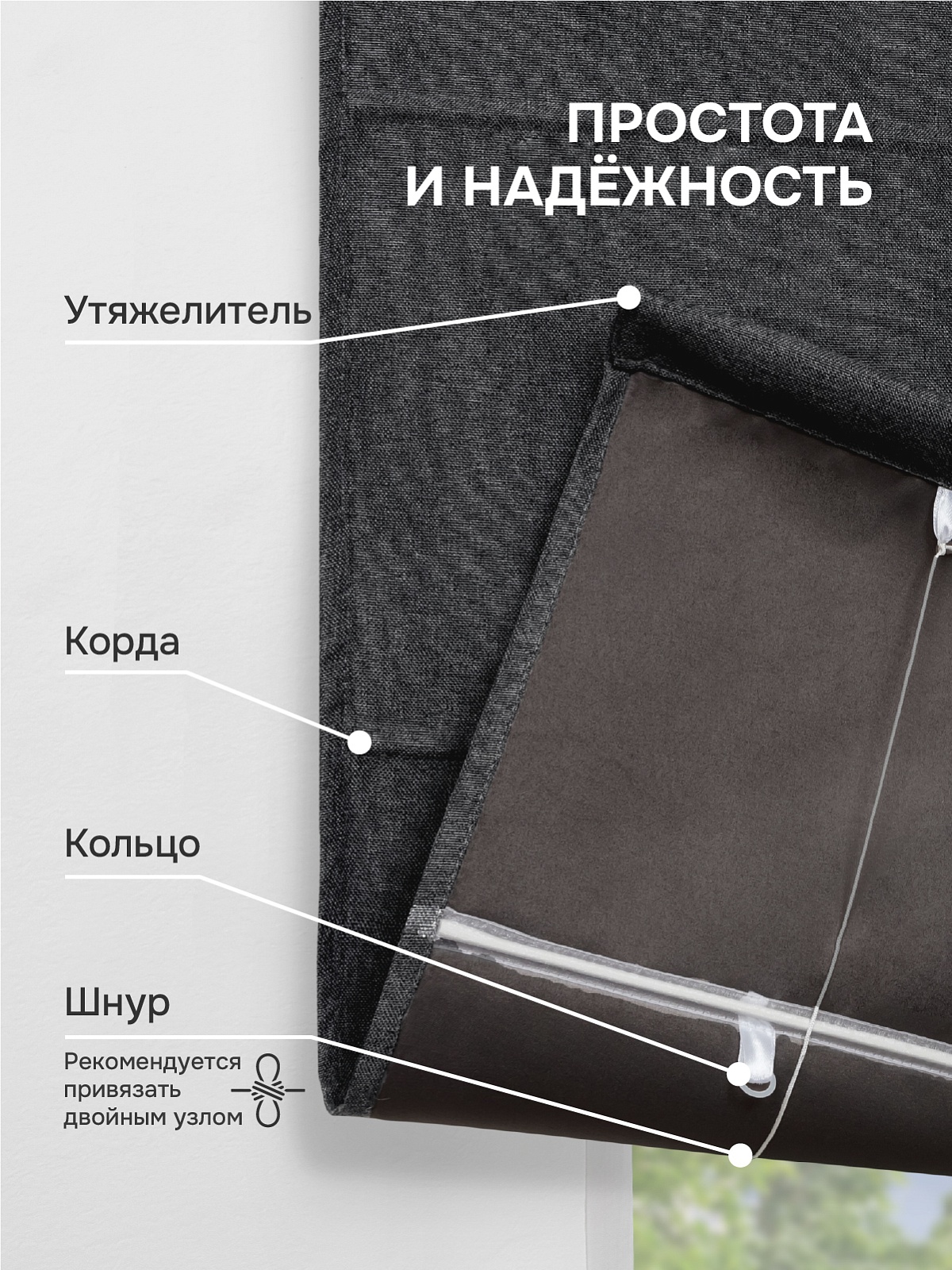 Штору можно прикрепить на стену или потолок. Комплект креплений в упаковке. Римская штора с веревочным механизмом собирается крупными складками и прекрасно подходит для любого типа окон. Элегантный минимализм шторы сочетается с функциональностью, обеспечивая контроль над освещением и приватностью.