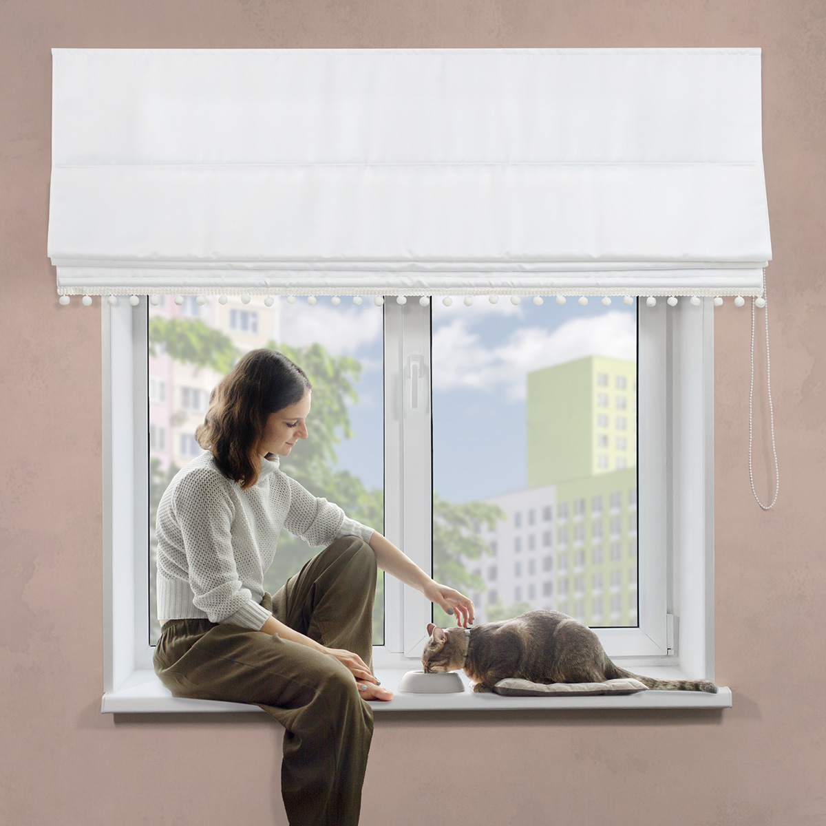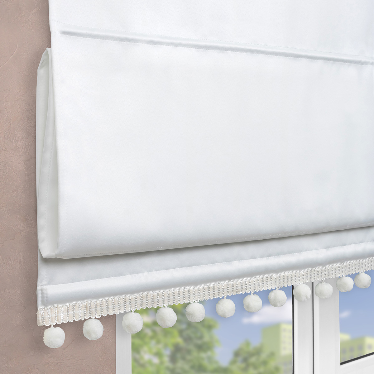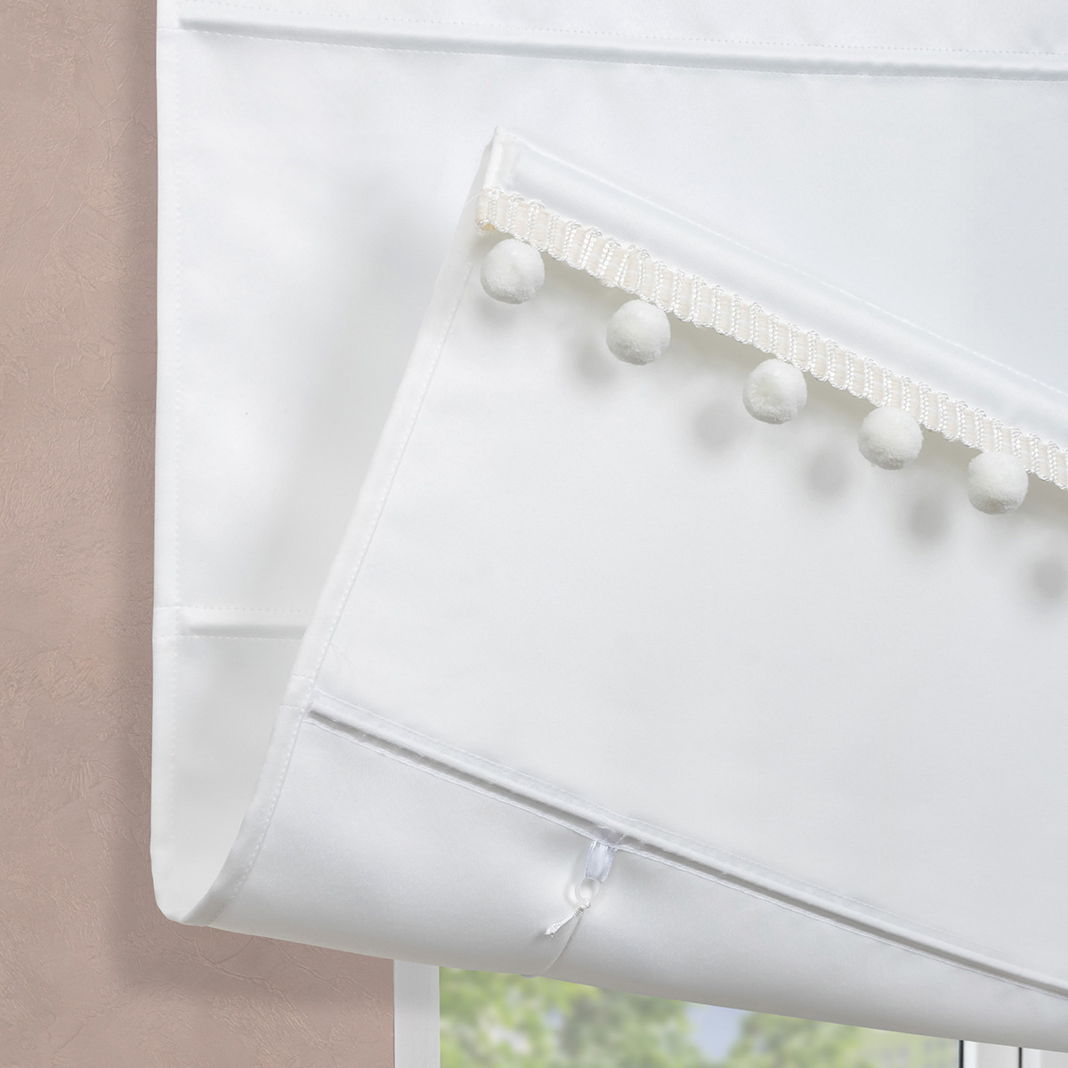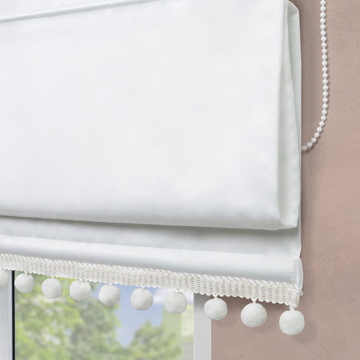 Римская штора с помпонами, Флавия Blackout на цепочном механизме, цвет белый