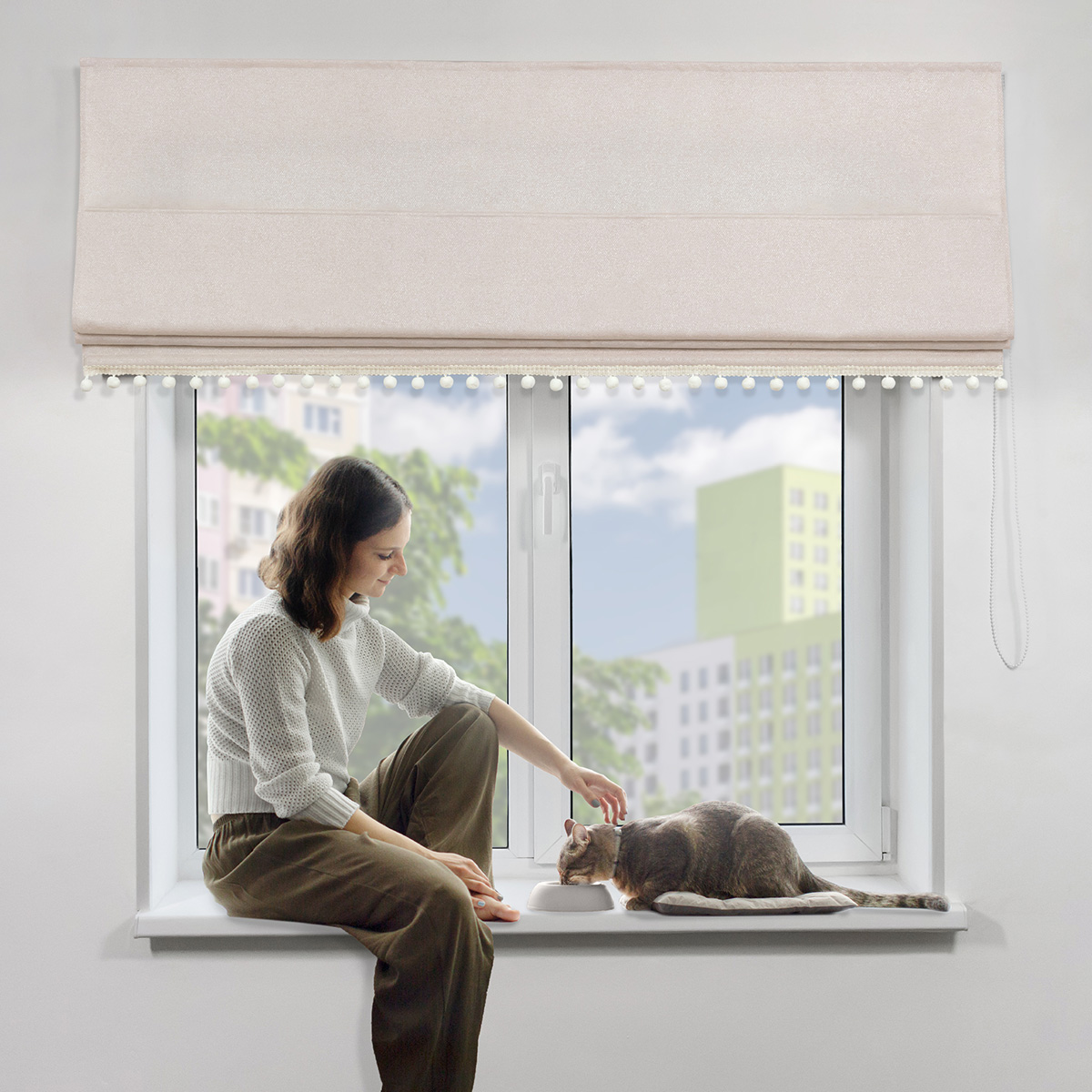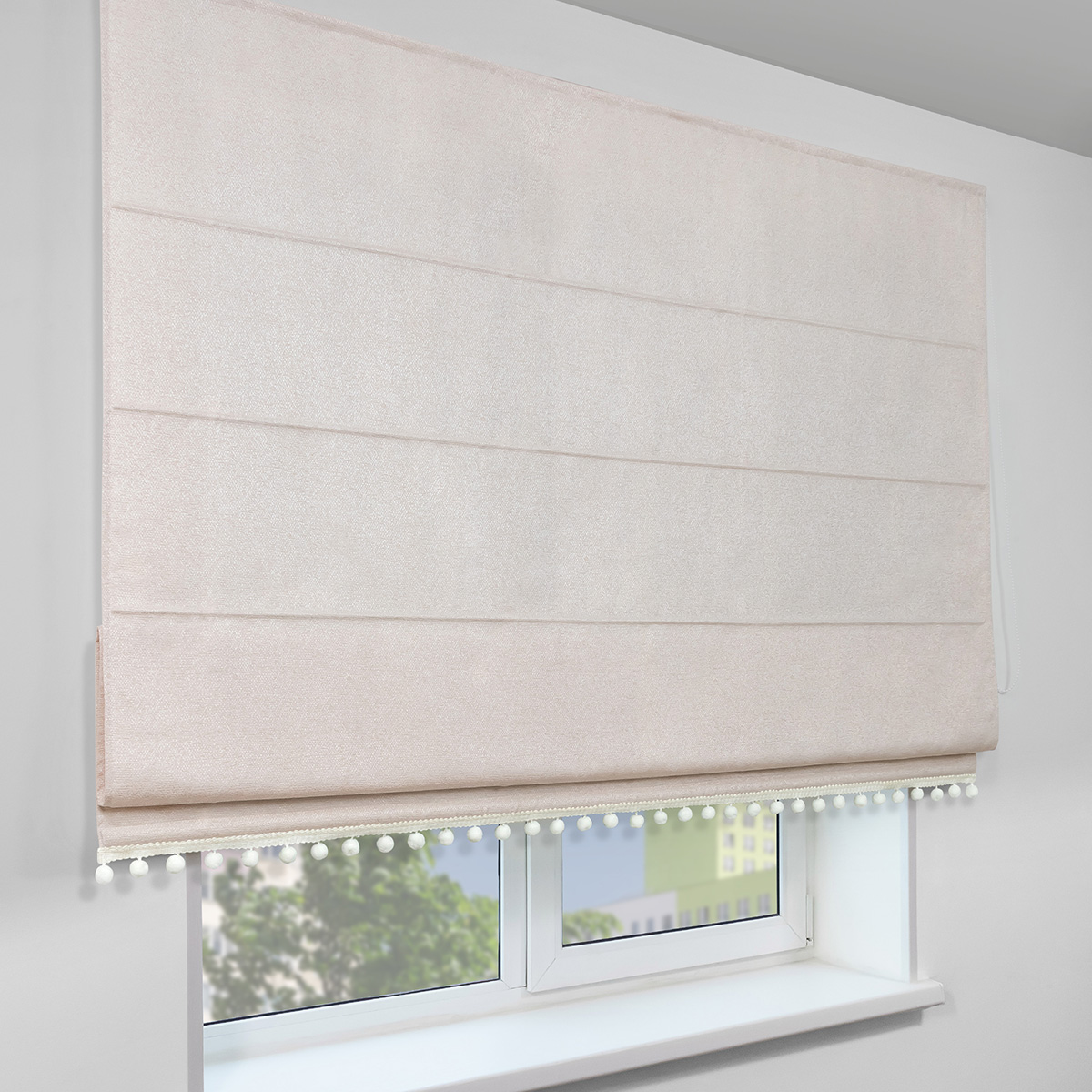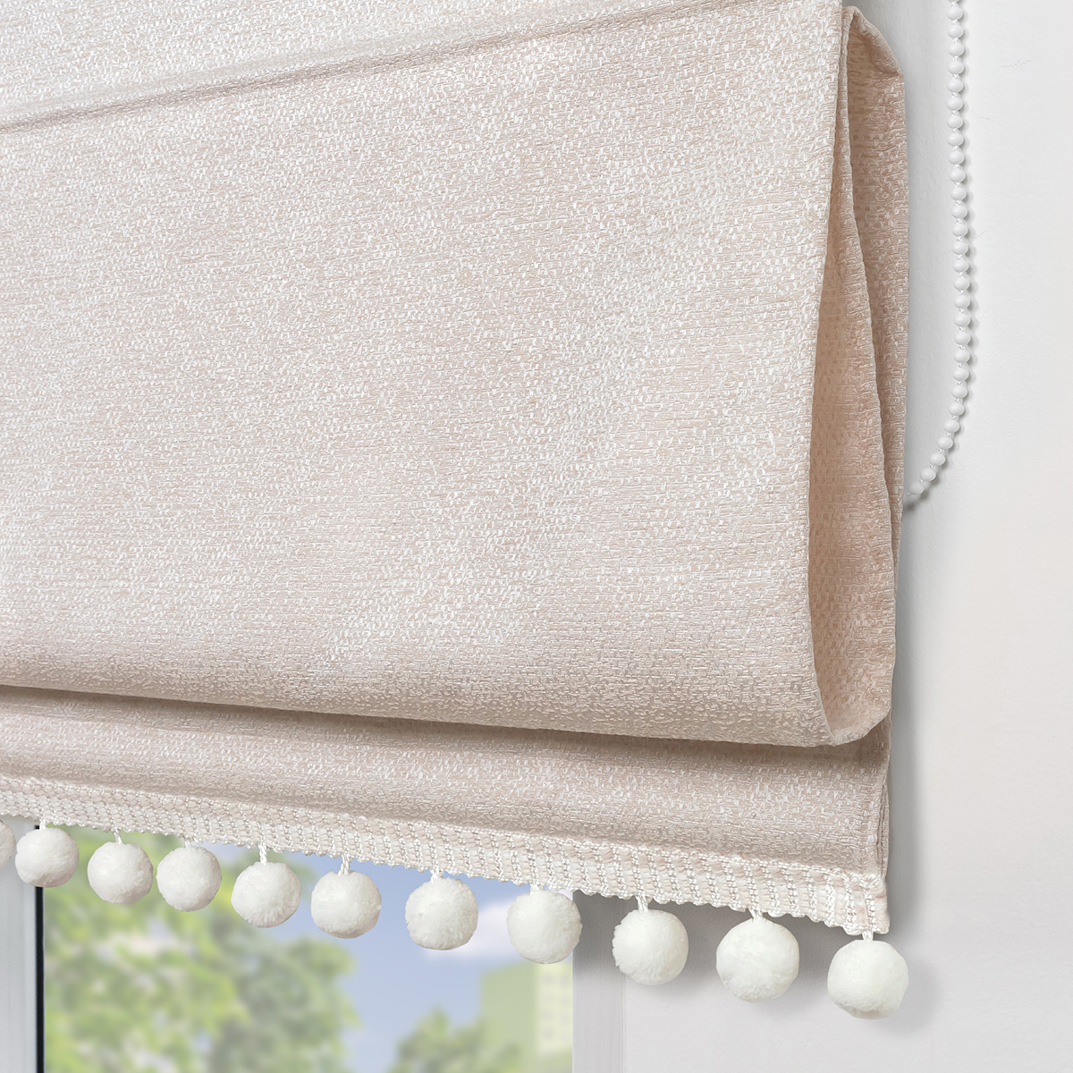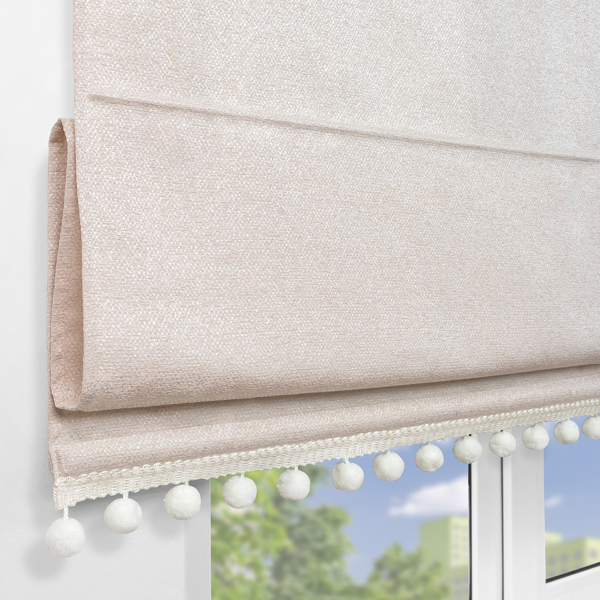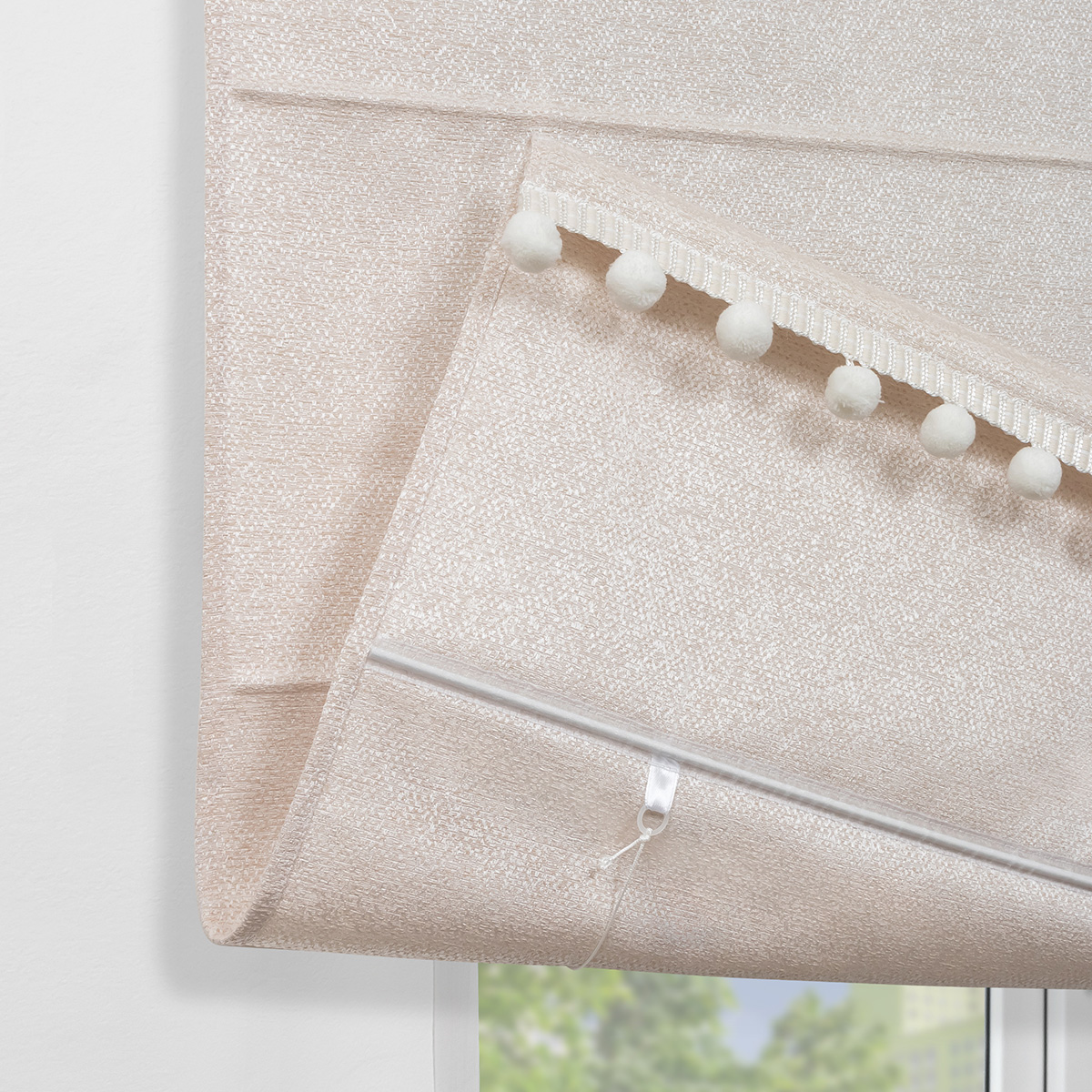 Римская штора с помпонами, Валенсия, на цепочном механизме, цвет бежевый