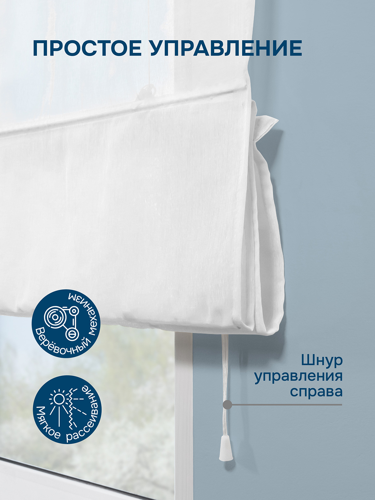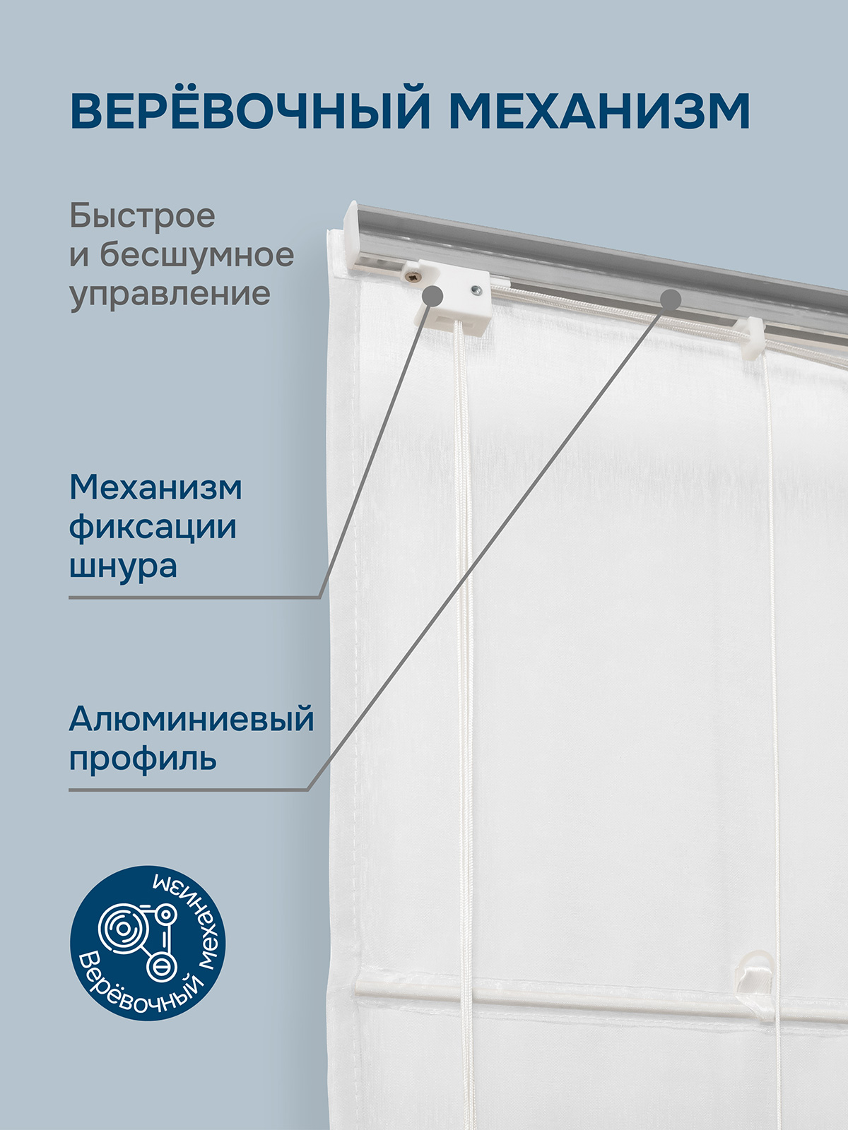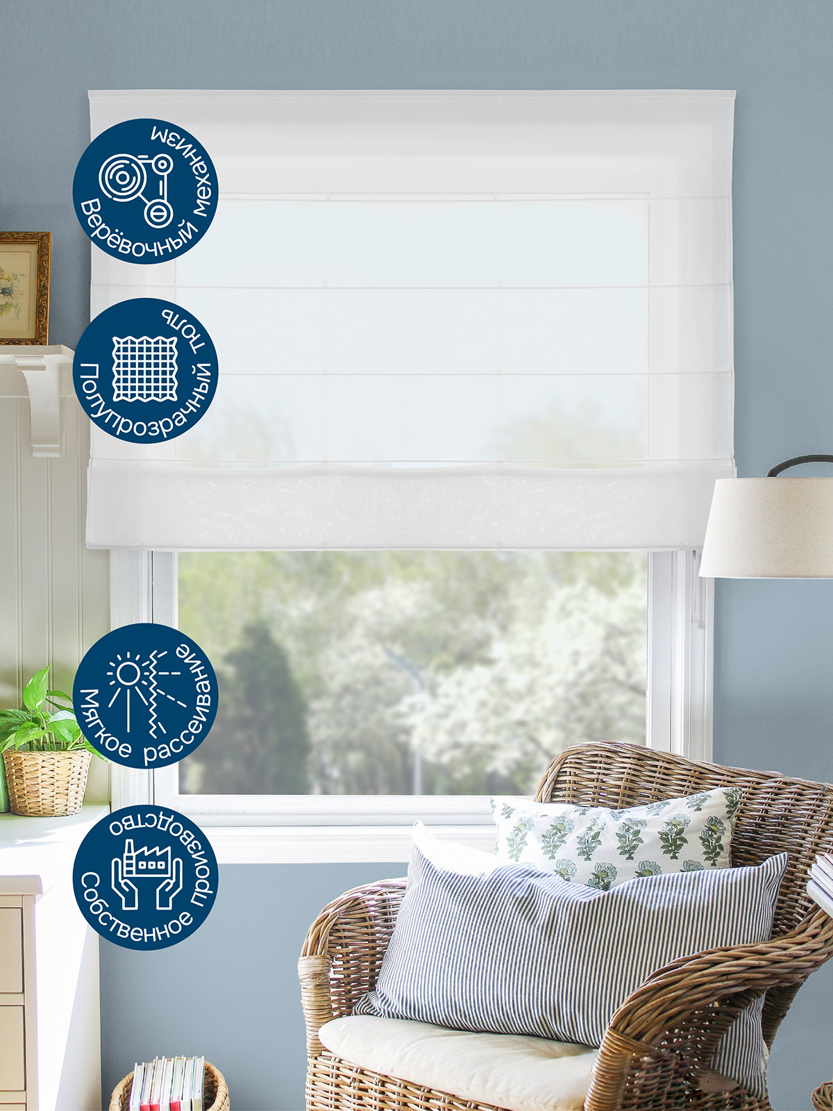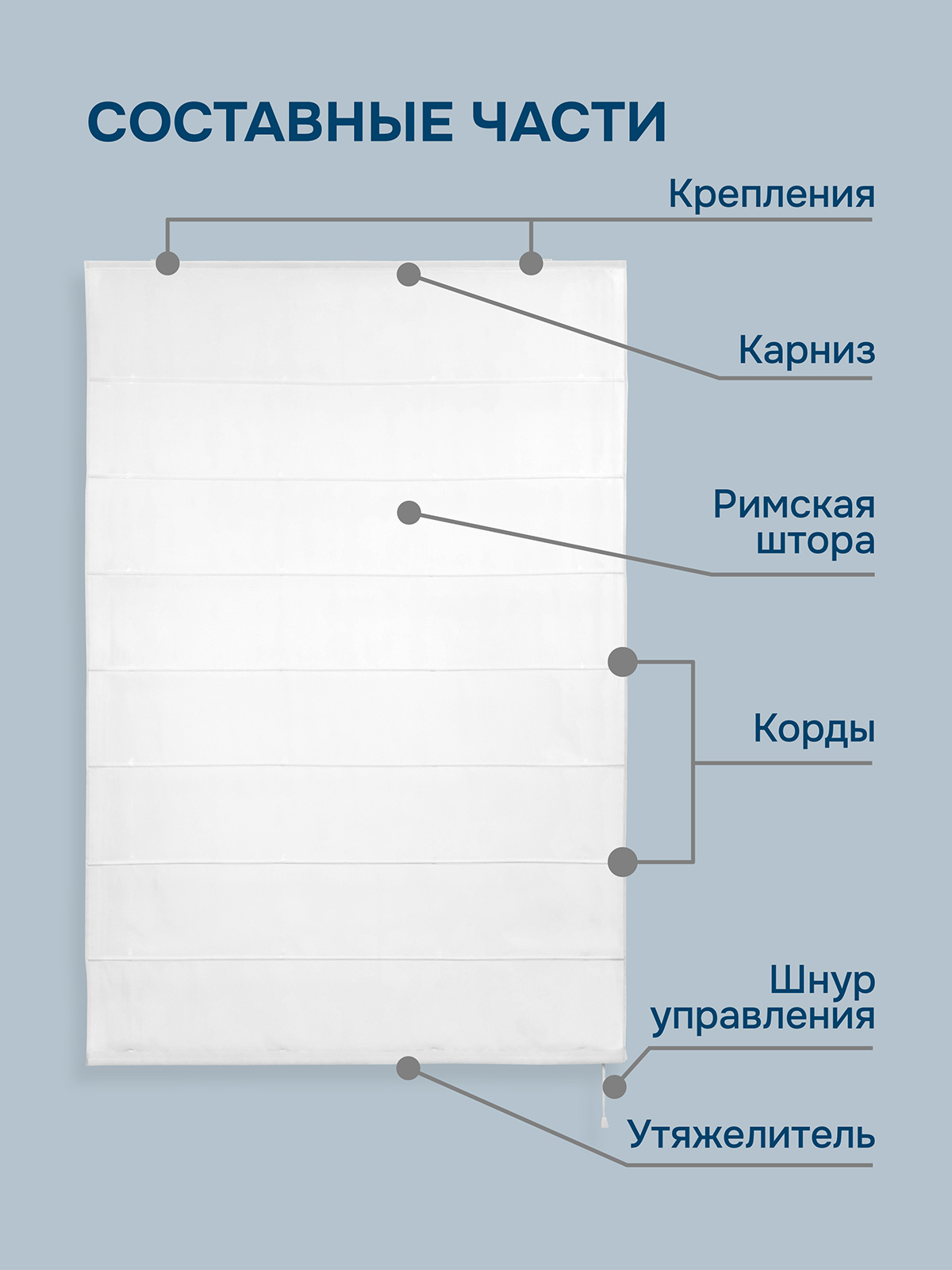 Комплектация: 1 римская штора в сборе, монтажный комплект для крепления, карниз для римских штор с веревочным механизмом, инструкция