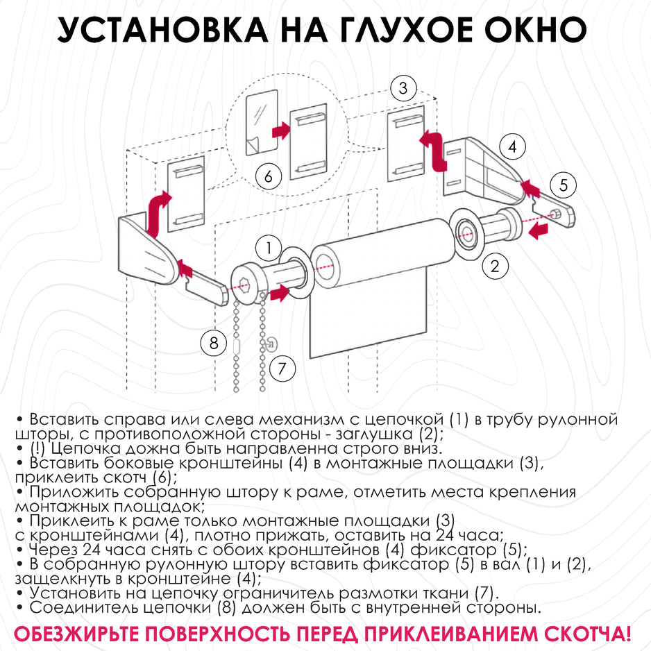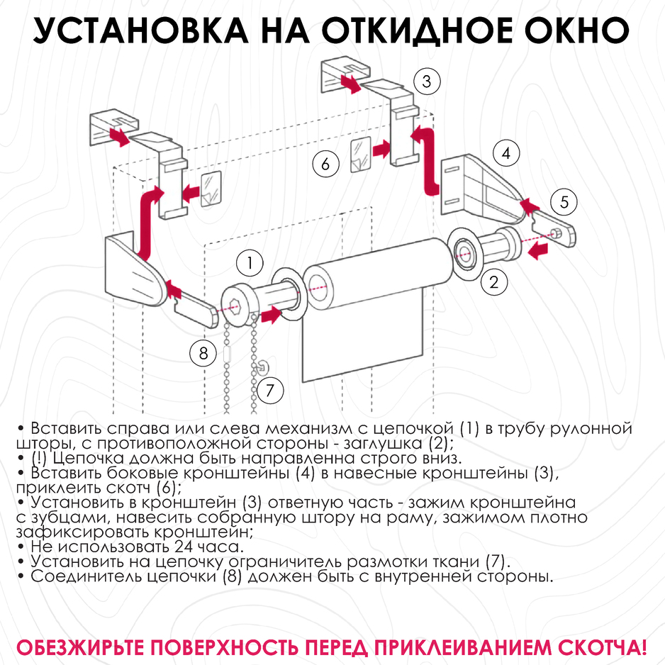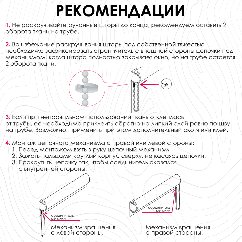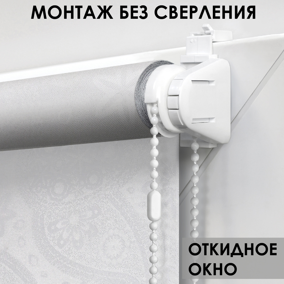 Рулонная штора - 1 шт. Монтажный комплект на глухое и откидное окно, цепочный механизм и заглушка.
