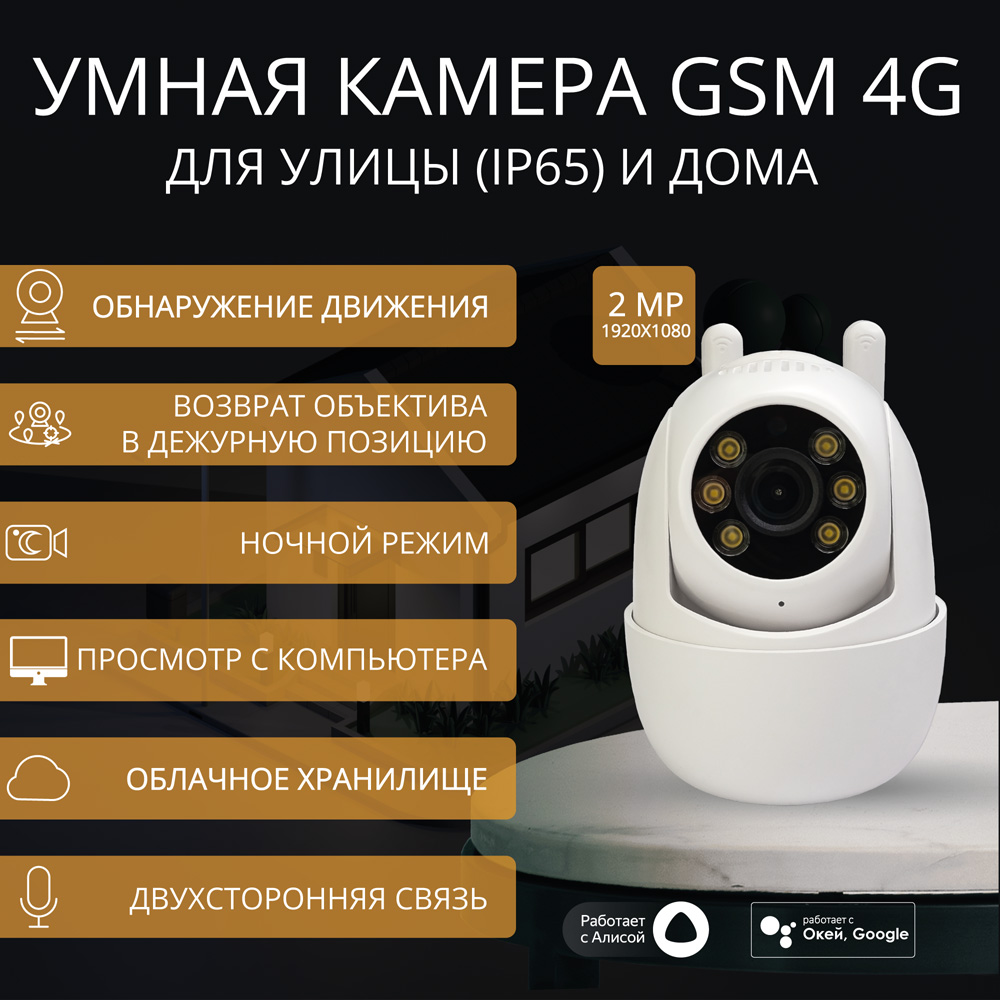 4G камера может работать на улице и имеет влагозащиту IP65. Компактный размер позволяет домашнее использование. Камера предназначена для работы там, где нет возможности организовать Wi-Fi сеть, но есть стабильный GSM сигнал одного из операторов связи. Камера имеет функцию поворота и может просматривать пространство на 360 градусов.