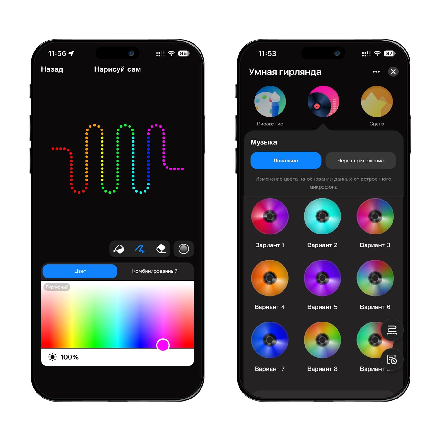 Гирлянде имеет встроенный звуковой сенсор, с помощью которого реагирует на звуки и музыку.