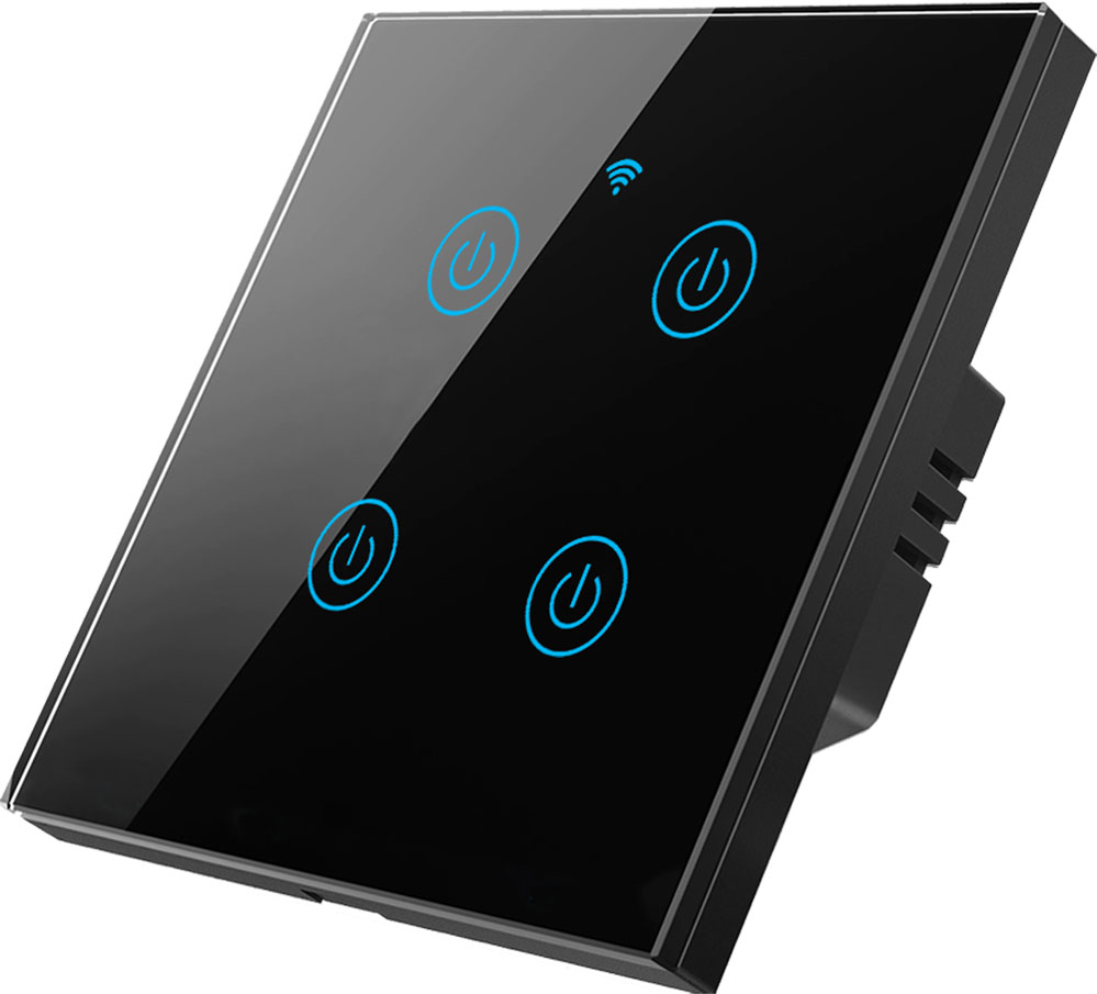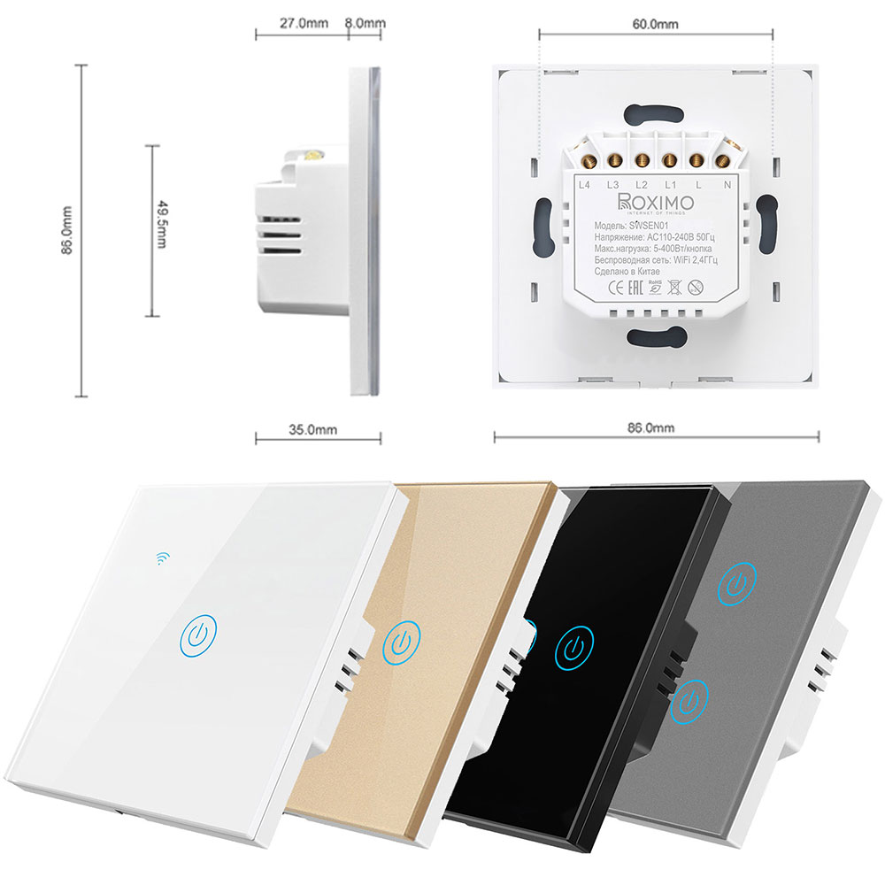 Лицевая панель изготовлена из закаленного стекла, стойкого к царапинам и повреждениям. На ней расположены сенсорные кнопки для управления и индикатор сети.