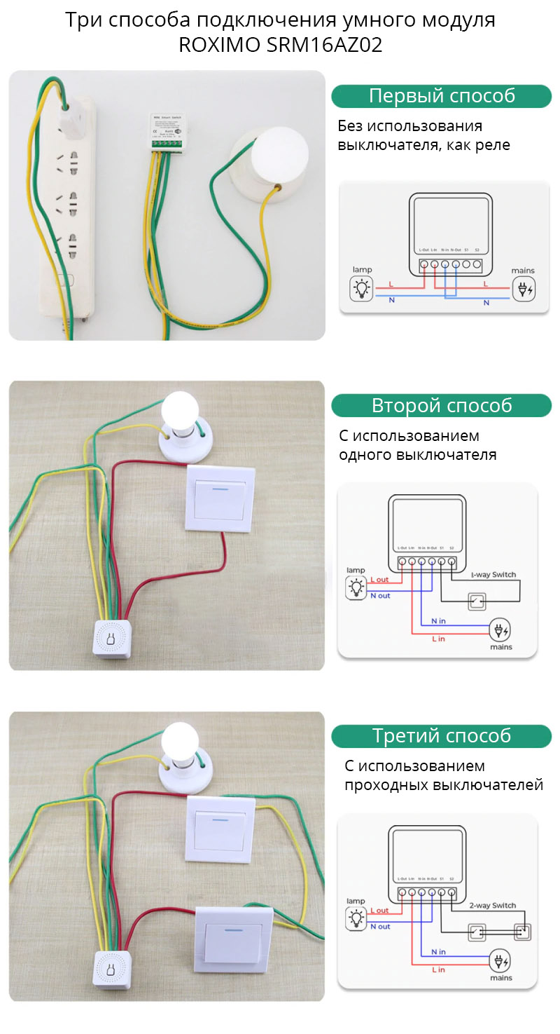 Подключение можно выполнить одним из способов: с использованием обычного выключателя, проходных выключателей или без выключателя, т.е. использовать модуль как умное реле.